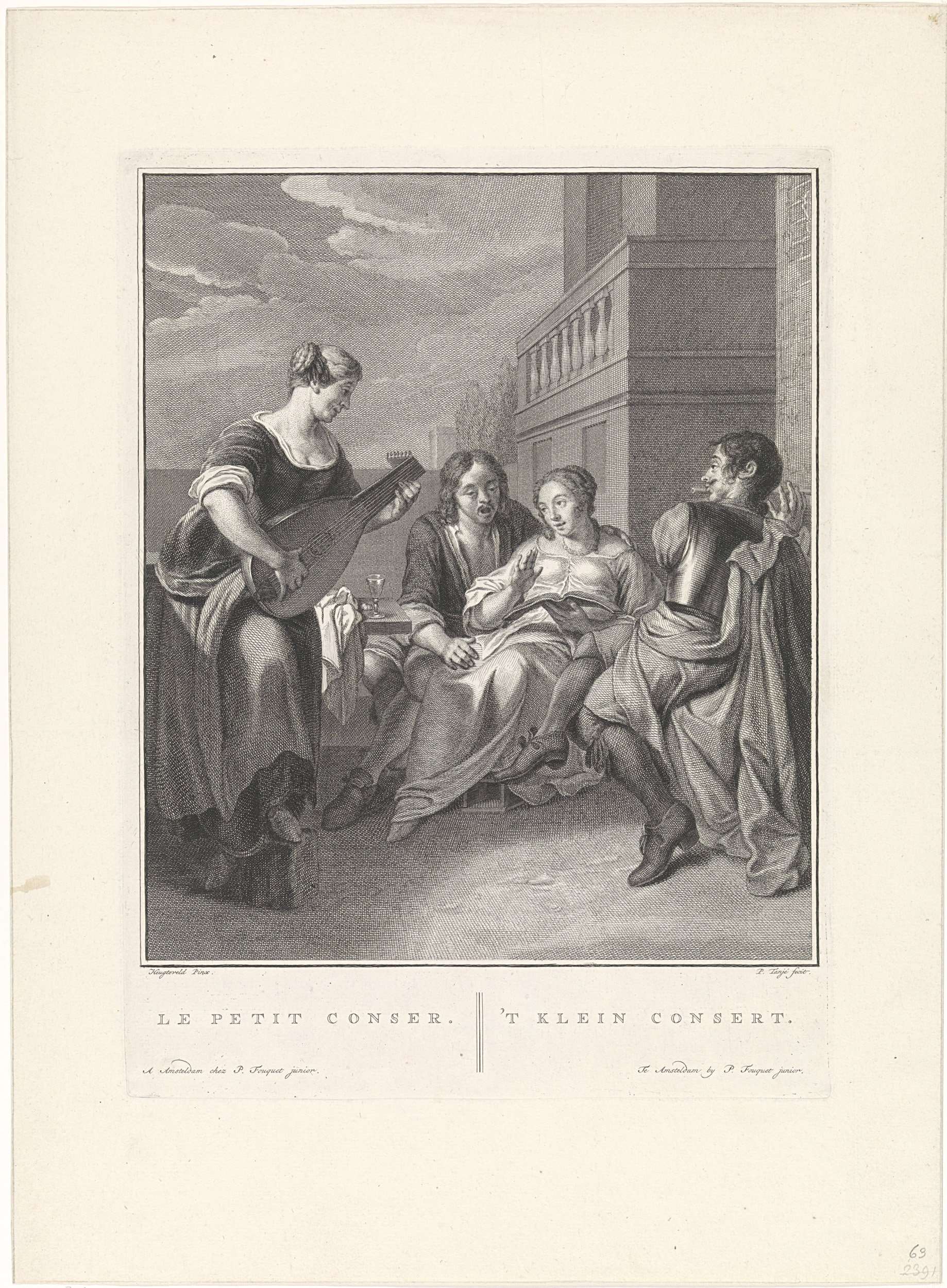 Op een terras in de buitenlucht musiceren vier mensen. De vrouw links bespeelt de luit, het stel in het midden zingt en de man rechts bespeelt de dwarsfluit.