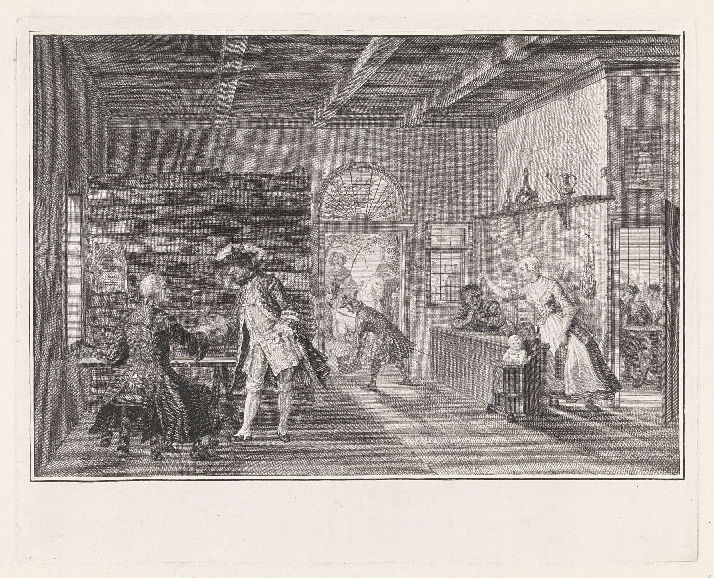 De verklede dieven Jan de Rolder en Piet Pothuis heffen het glas in de gelagkamer, waar Swaantje achter de tapkast tegen haar man Fobert staat te tieren. Ze is daar zo druk mee, dat ze niet door heeft dat ze wordt bestolen. In de zijkamer rechts zitten Hartje Spilpenning en Saartje van Lichten gekleed als ...