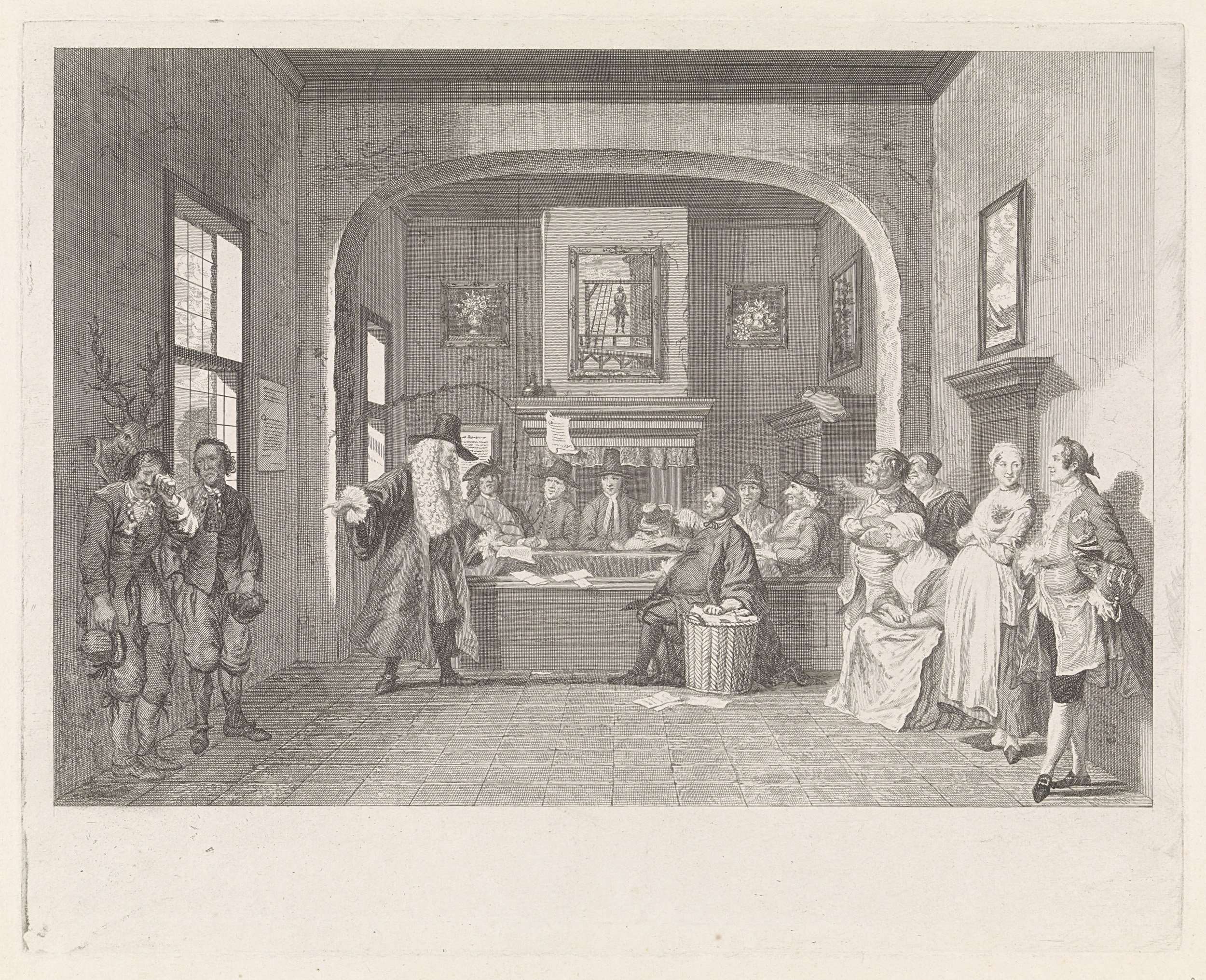Voor de boerenrechtbank van Puiterveen staan links de huilende Fobert en zijn vader en rechts de zwangere Swaantje tussen jonker Jan en haar ouders. Swaantje is bezwangerd door de zoon van de heer van Puijterveen, maar Fobert wordt van deze daad beschuldigd. De corrupte advocaat van Fobert is aan het pleiten, terwijl de advocaat van ...