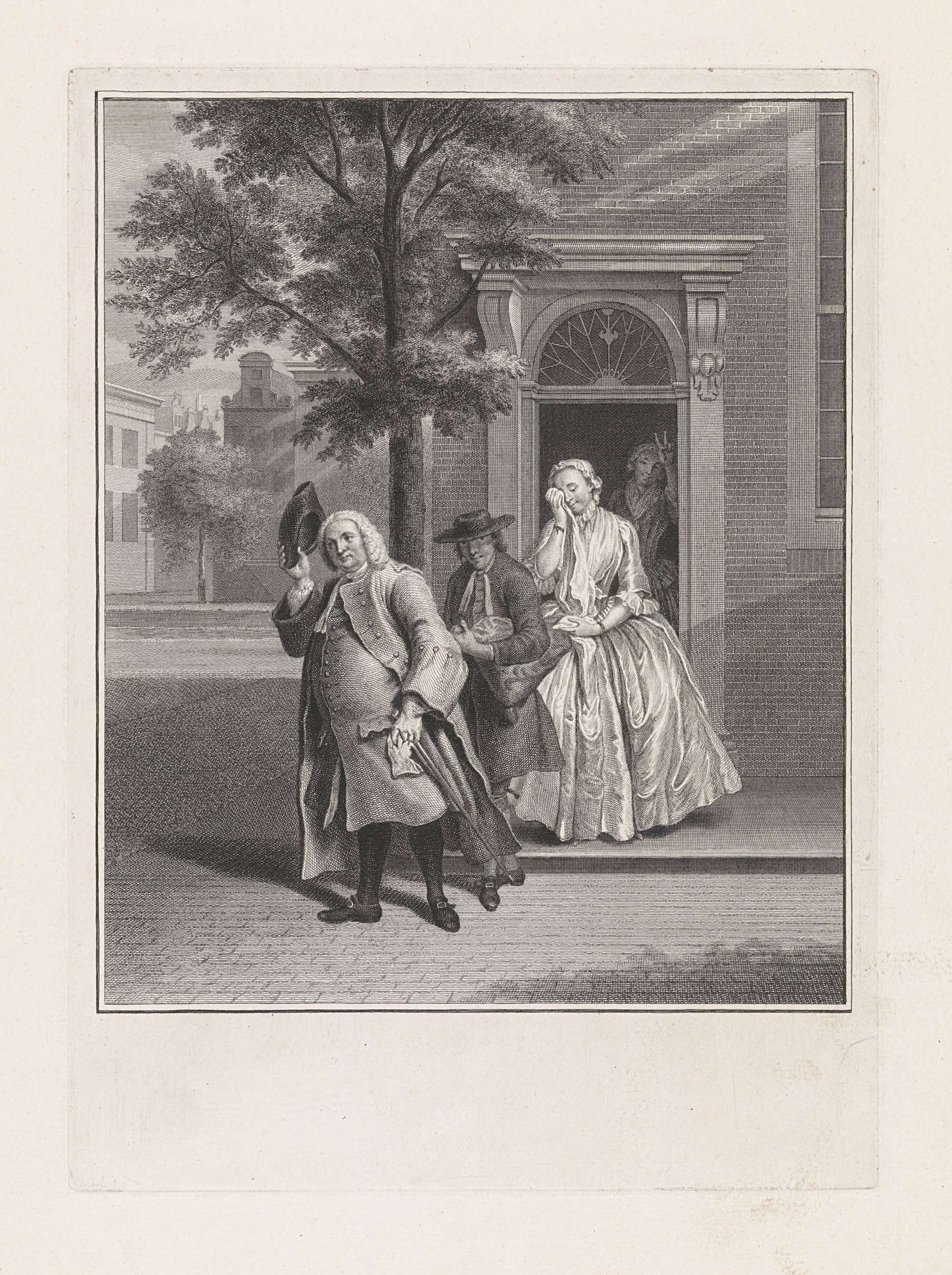 Geertruy veinst verdriet als ze haar man Filibert, die op zakenreis gaat, gedag zegt. Filibert heeft zojuist van zijn knecht Joris, die achter hem loopt, vernomen dat Geertruy hem met zijn neef bedriegt. De dienstmeid Bely bespot Filibert als bedrogen echtgenoot door twee vingers als horentjes bij haar hoofd te houden. Scène uit het toneelstuk ...