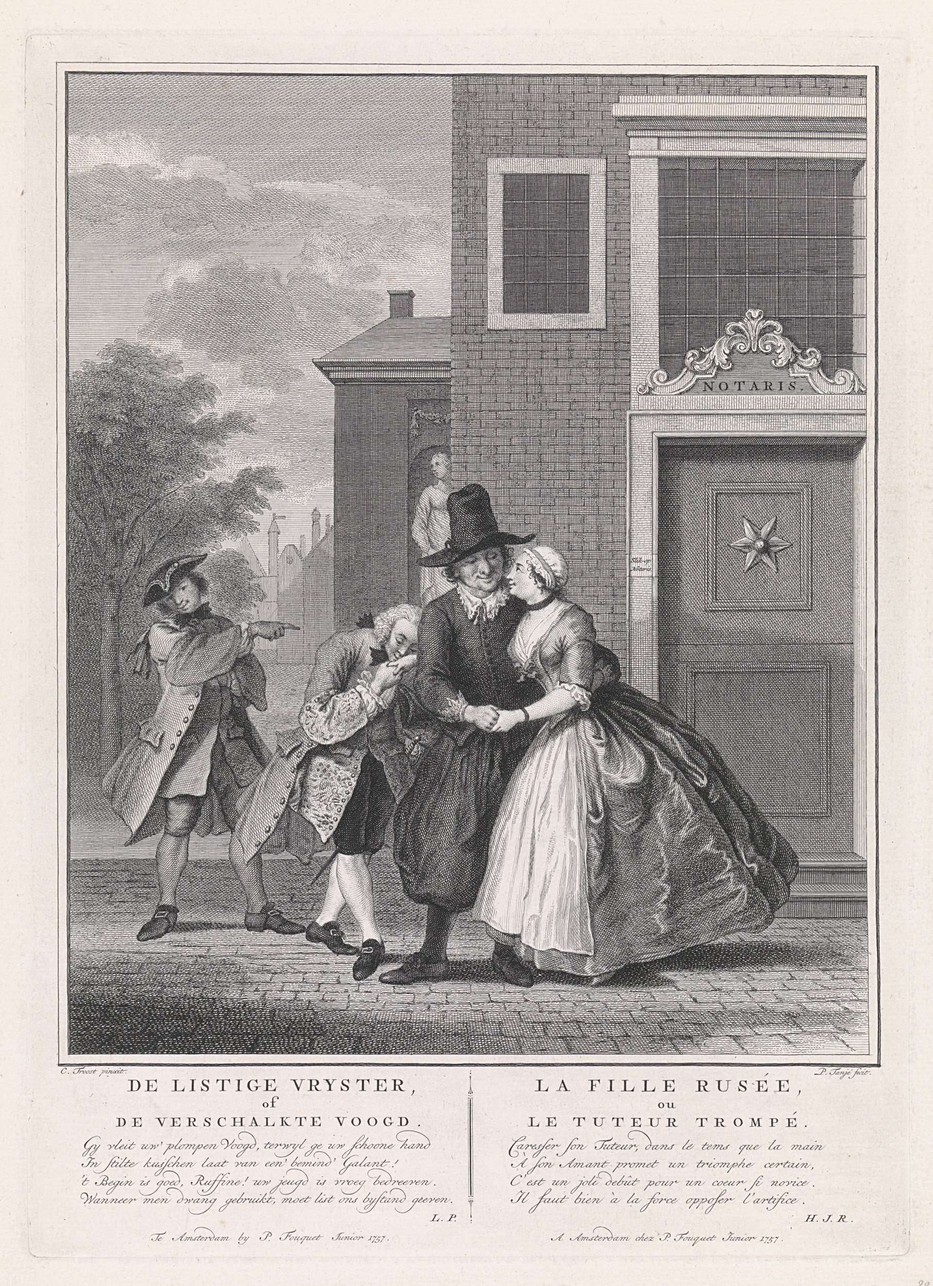 Ruffina reikt haar geliefde Heerman in het geheim de rechterhand, terwijl ze haar voogd Steiloor aankijkt, met wie ze van de notaris komt. Onderaan in de marge een vierregelig vers in het Nederlands en het Frans. Scène uit het toneelstuk De listige vryster, óf de verschalkte voogd, van Ysbrand Vincent.