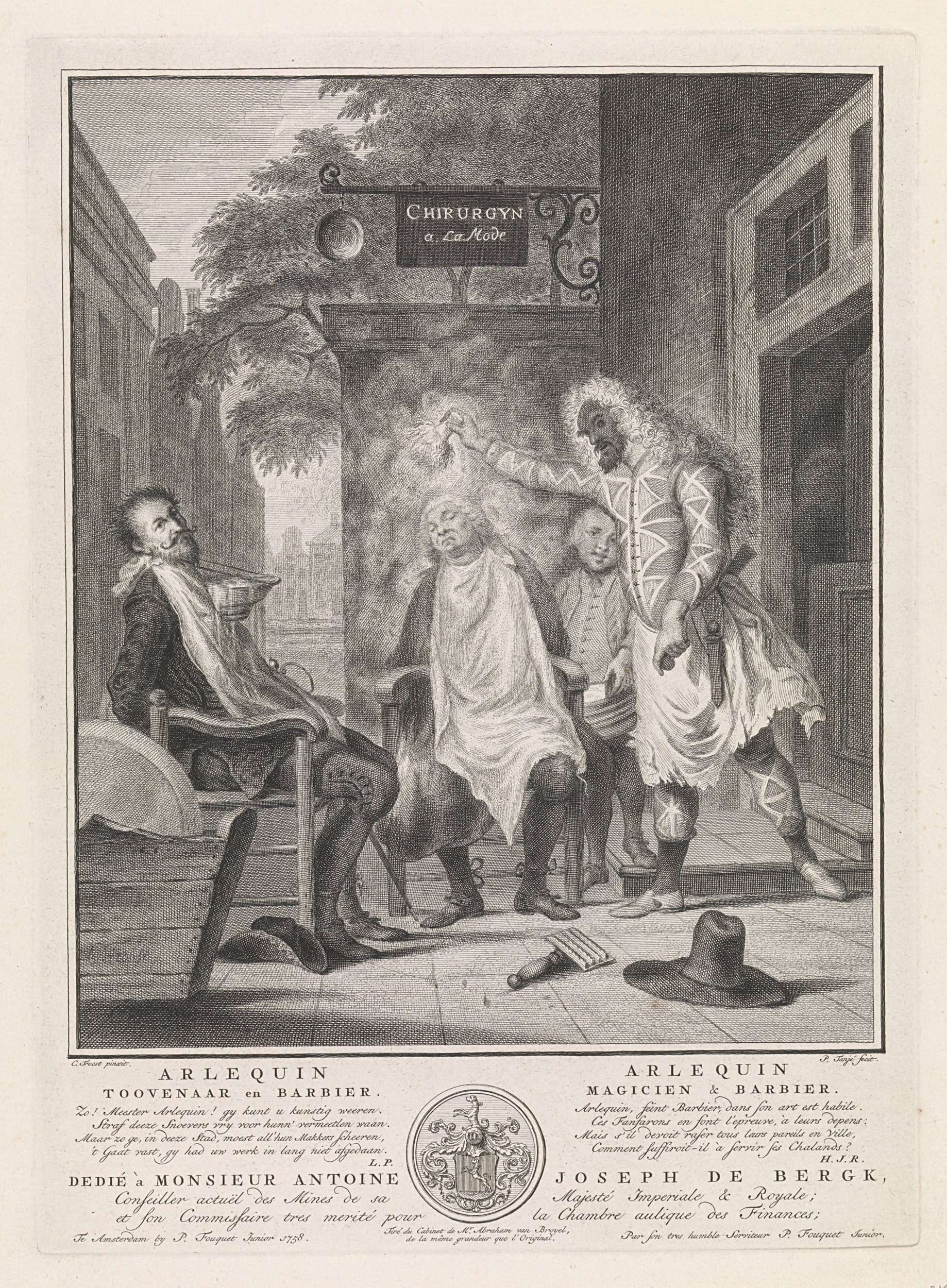 Belloardo en Capitano worden door de als barbier verklede Arlequin hardhandig geschoren en bepoedert met natgemaakt meel. Zijn knechtje Pierot houdt de bak met meel op. Arlequin heeft onder zijn linkerarm een knuppel verborgen waarmee hij zijn rivalen Belloardo en Capitano tot slot zal bewerken. Onderaan in de marge een vierregelig vers in het Nederlands ...