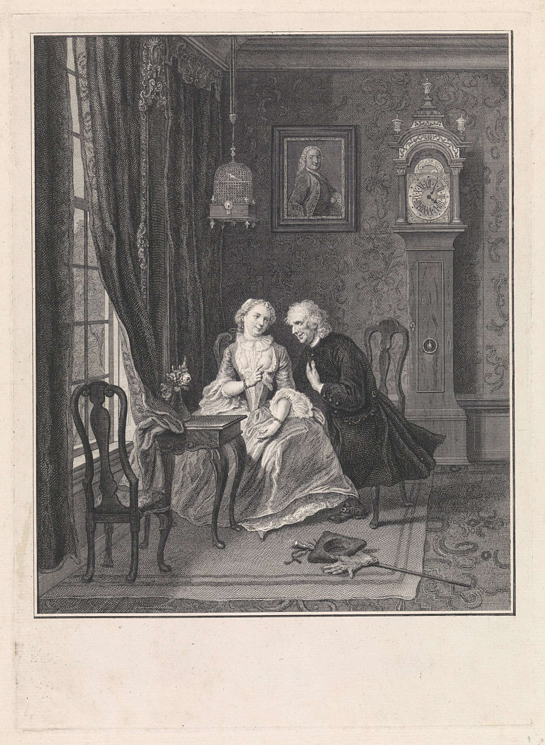 Joost, een oude weduwnaar en de vader van Lucia's geliefde, bekent aan Lucia zijn liefde. Scène uit het toneelstuk De wanhébbelyke liefde, van Philippe Quinault.