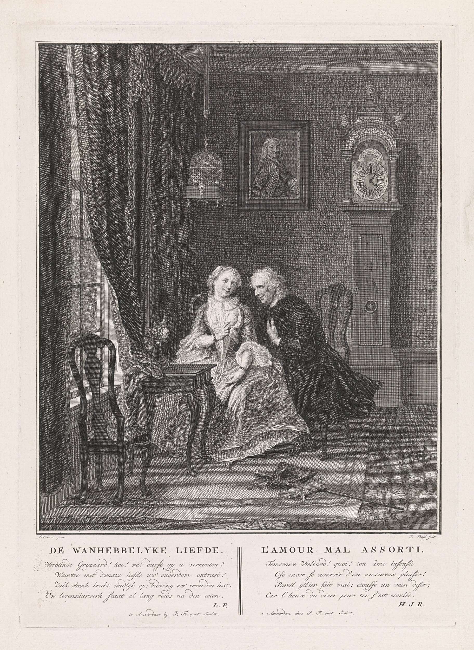 Joost, een oude weduwnaar en de vader van Lucia's geliefde, bekent aan Lucia zijn liefde. Onderaan in de marge een vierregelig vers in het Nederlands en het Frans. Scène uit het toneelstuk De wanhébbelyke liefde, van Philippe Quinault.