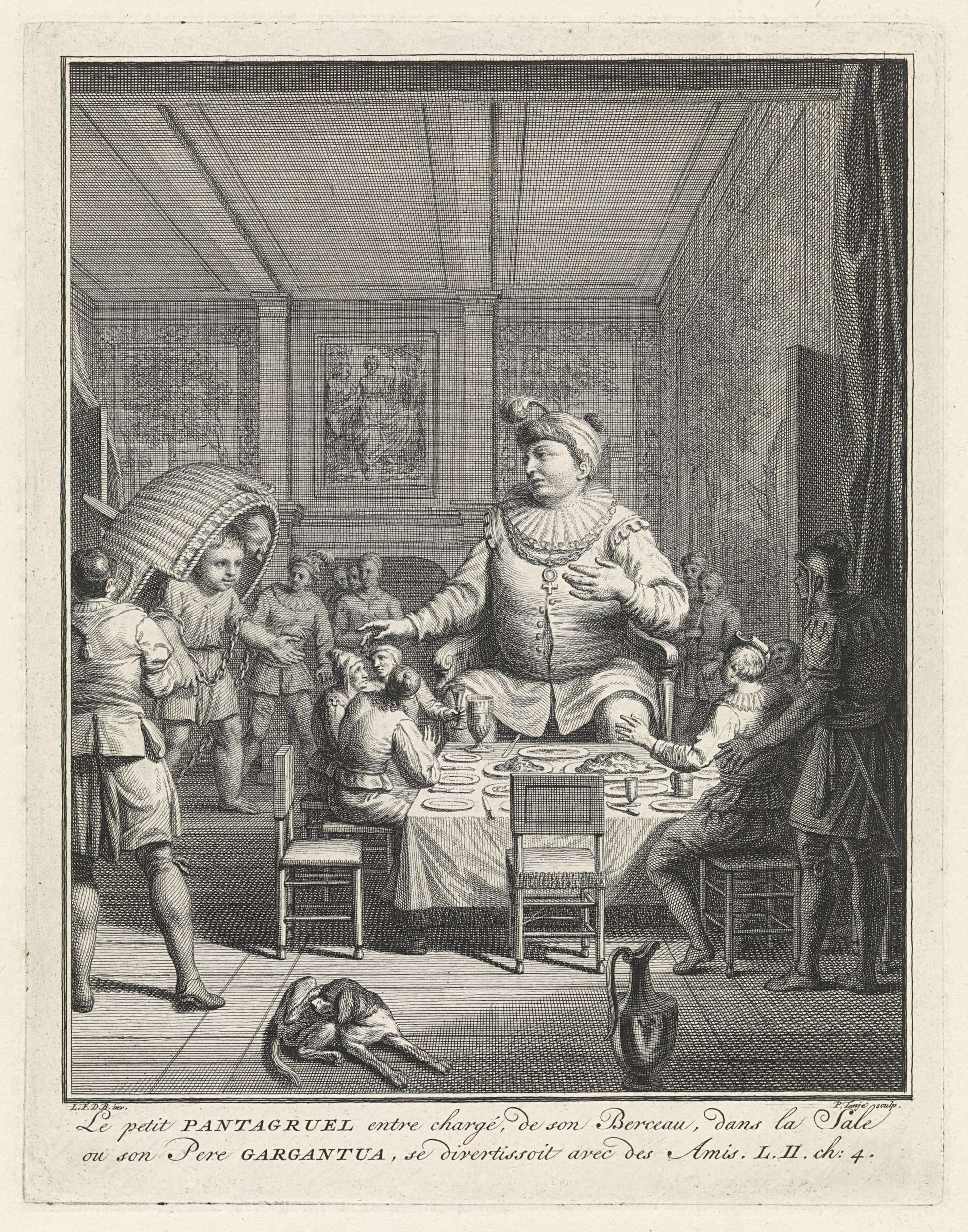 De baby Pantagruel, een kind van reuzen, komt met zijn wieg nog op zijn rug de zaal binnen, waar zijn vader Gargantus met zijn vrienden aan de maaltijd zit. Illustratie bij de verhalen van François Rabalais over Pantagruel en Gargantua. In de marge staat een regel tekst in het Frans, rechtsonder gemerkt: L. II. Ch: ...