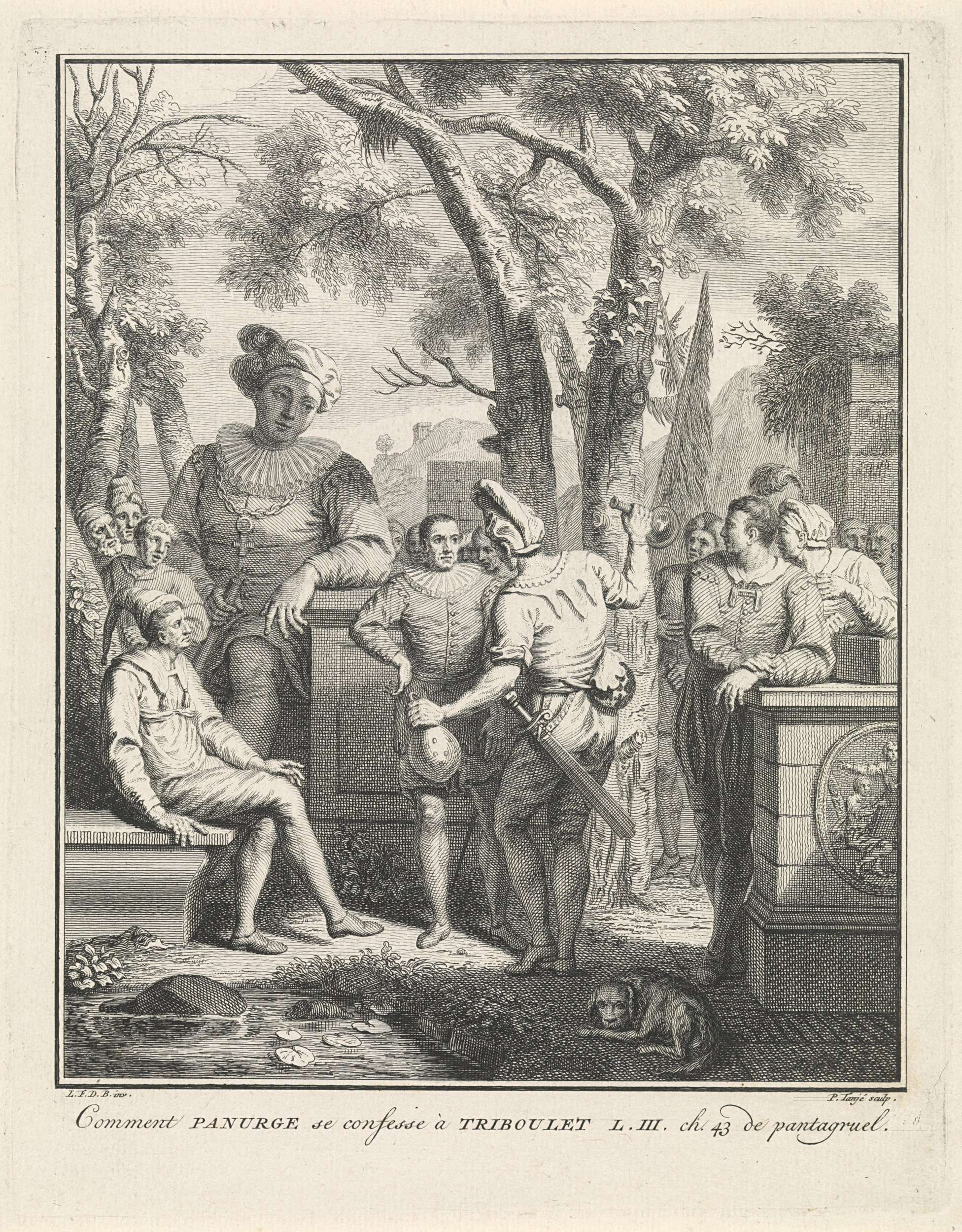 De sluwe schurk Panurge bekent aan Triboulet. Om hen heen staan mensen en links zit de reus Pantagruel. Illustratie bij de verhalen van François Rabalais over Pantagruel en Gargantua. In de marge staat een regel tekst in het Frans, rechtsonder gemerkt: L. III. Ch. 43.
