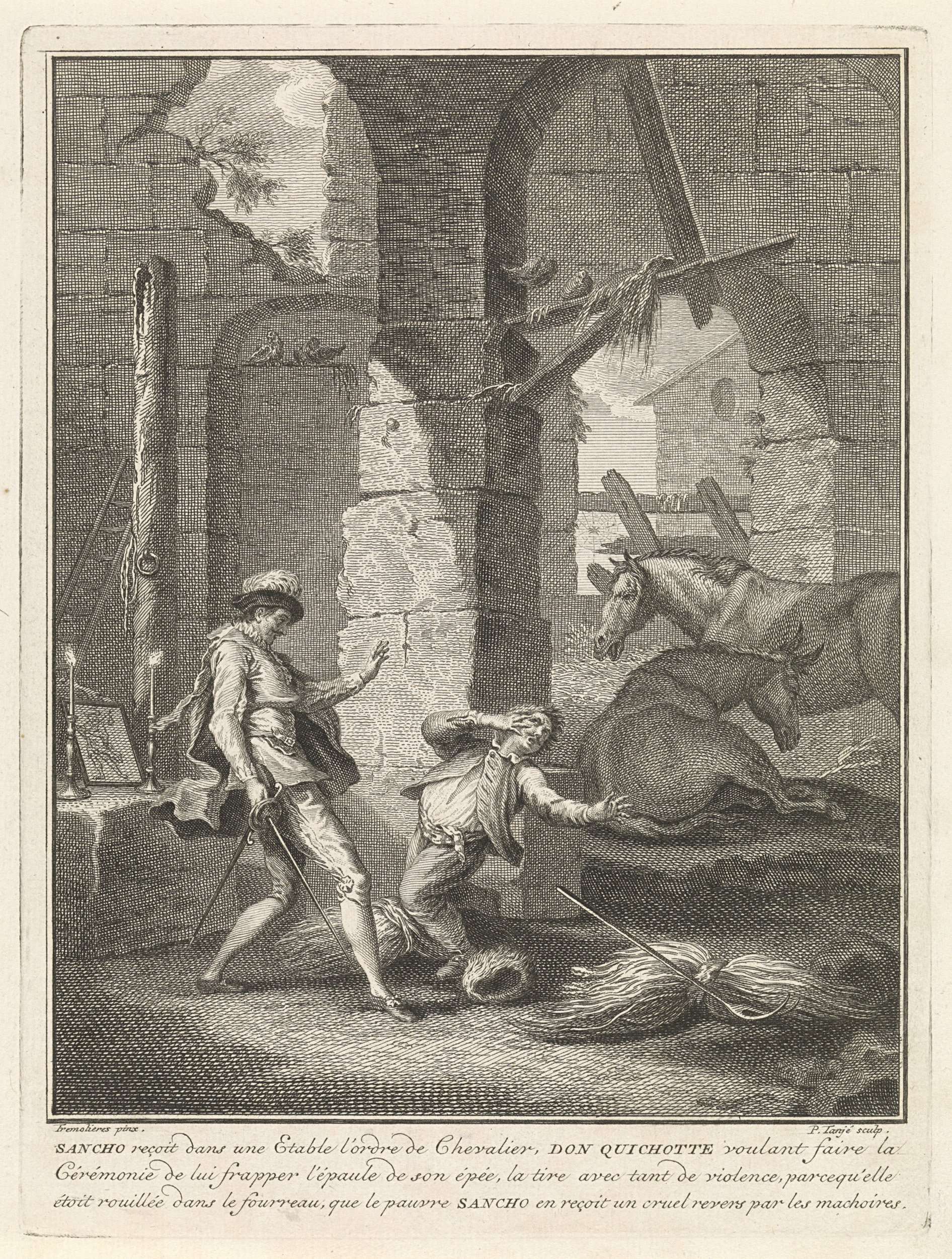Sancho Panza wordt in een stal door Don Quichot tot ridder geslagen. Sancho valt door de slag achterover. Onderaan in de marge een onderschrift in het Frans.