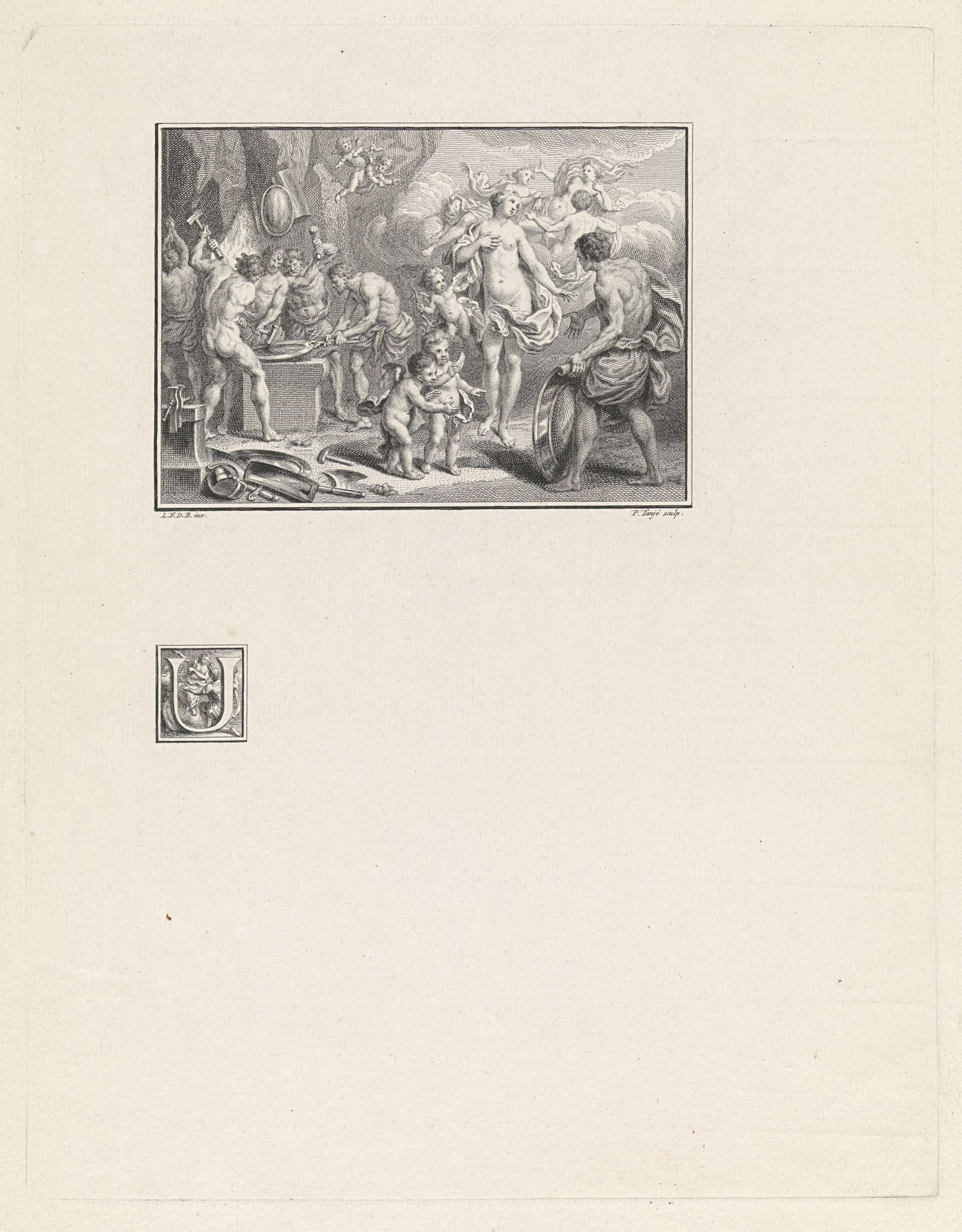 Venus is samen met Amor op bezoek in de smidse van Vulcanus. Zij vraagt hem een wapenrusting voor Aeneas te maken. Illustratie en initiaal U bij de Aeneis van Vergilius.