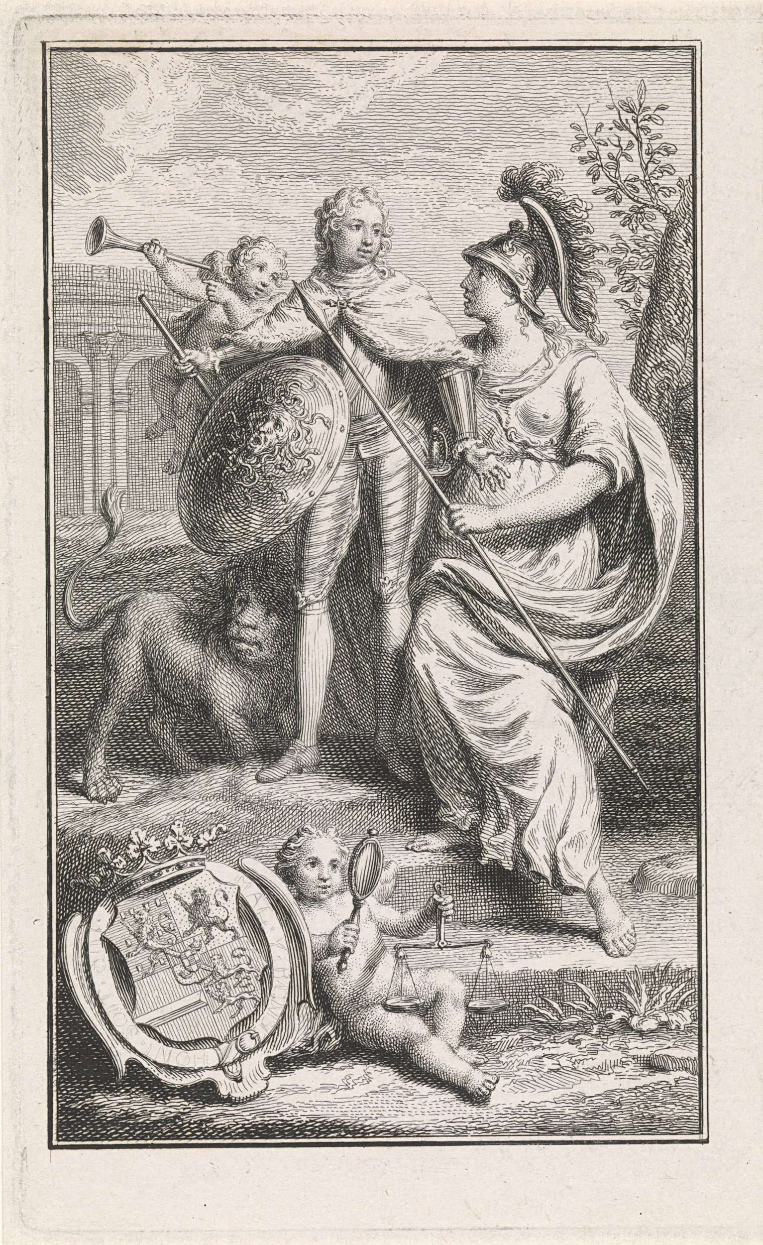 Willem V, prins van Oranje-Nassau staande naast Minerva, wiens schild hij heeft gekregen. Naast hem de Hollandse leeuw. Op de voorgrond zijn wapenschild en een putto met de spiegel van voorzichtigheid en de weegschaal van rechtvaardigheid.
