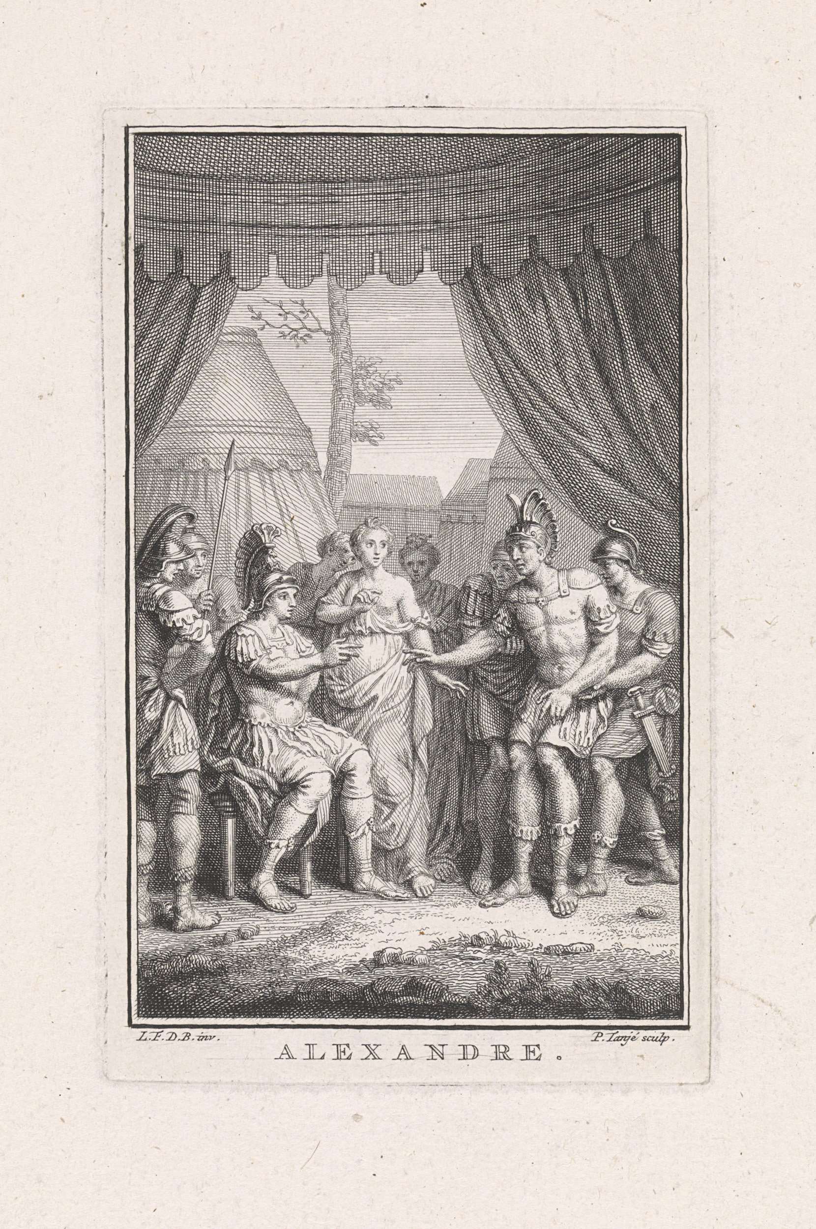 Alexander de Grote gezeten op een stoel met prinses Cleofile aan zijn zijde. Een man wordt door een soldaat naar Alexander geleid. Boekillustratie bij de tragedie 'Alexandre le Grand' van Jean Baptiste Racine.