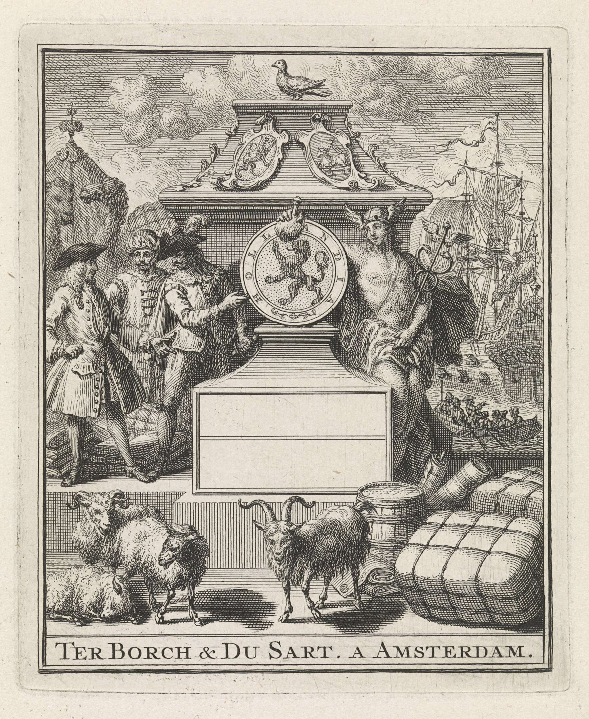 Monument met het wapen van Holland, geflankeerd door handelaren en Mercurius. Op de achtergrond kamelen en een schip. Op de voorgrond schapen, een ton en andere handelswaar. Handelsetiket voor Ter Borch & Du Sart te Amsterdam.