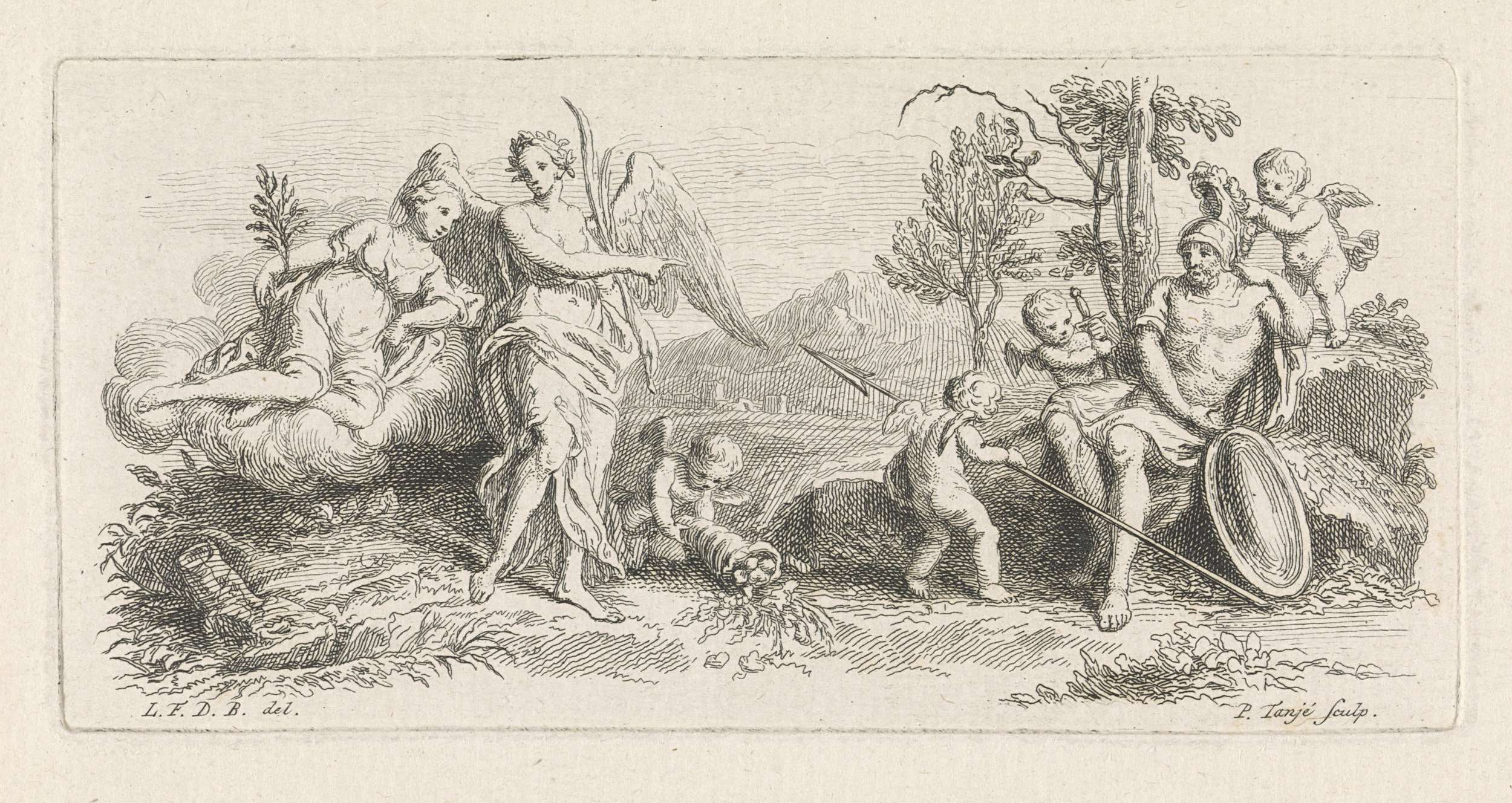Vrede, liggend met een olijftak op een wolk, heeft de overwinning behaald, want naast haar staat Victoria met haar palmtak. Victoria wijst op de oorlogsgod Mars, wiens wapens worden afgepakt door putti. In het midden speelt een putto met een hoorn des overvloeds.