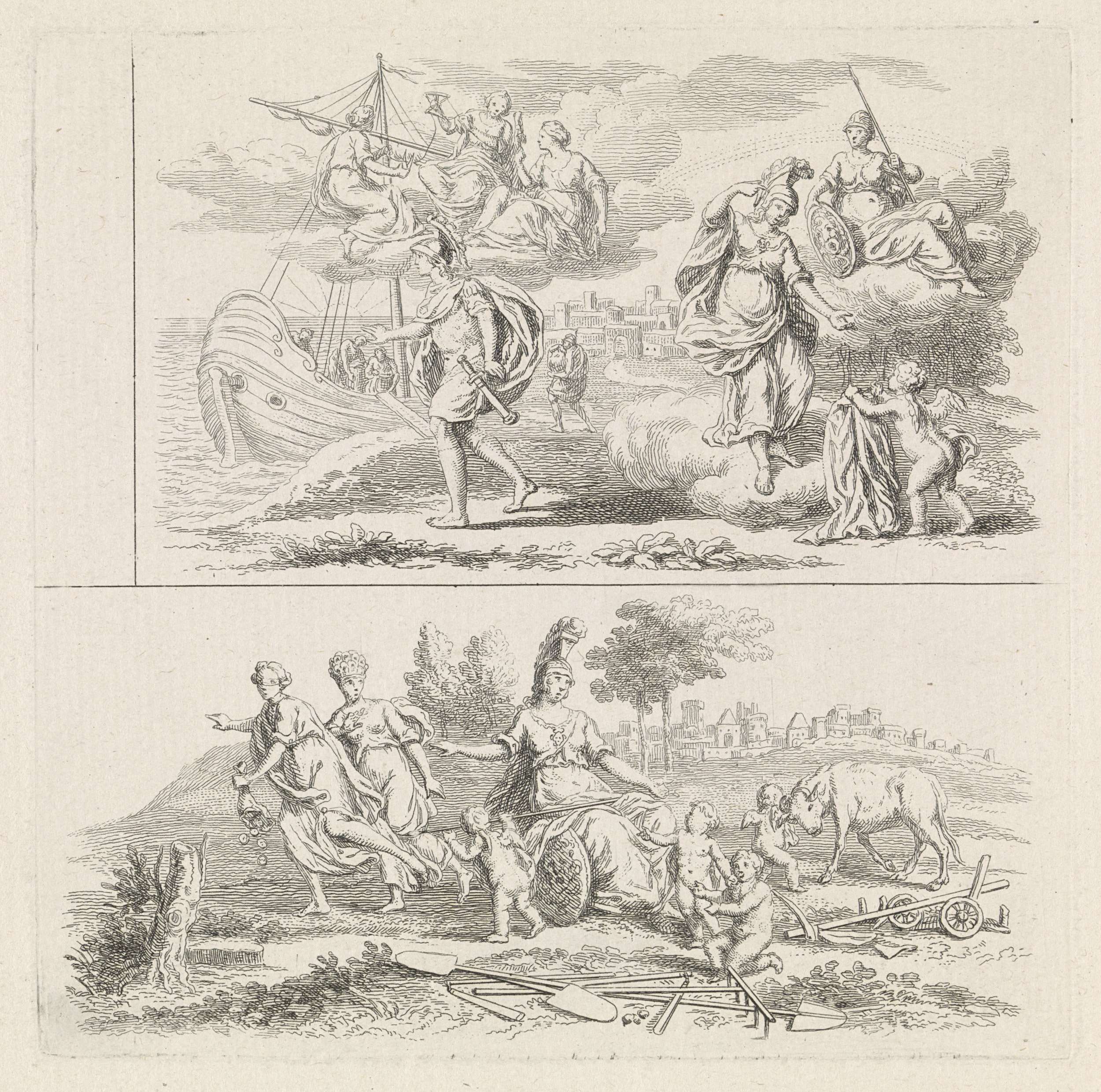 Op de bovenste voorstelling daalt Minerva van een wolk naar Amor, die een kledingstuk ophoudt. Links een held en een schip. Op de onderste voorstelling zit Minerva op een akker, waar verschillende putti om haar heen zitten. Ze wijst op Fortuna, die samen met een andere vrouw, wegloopt.