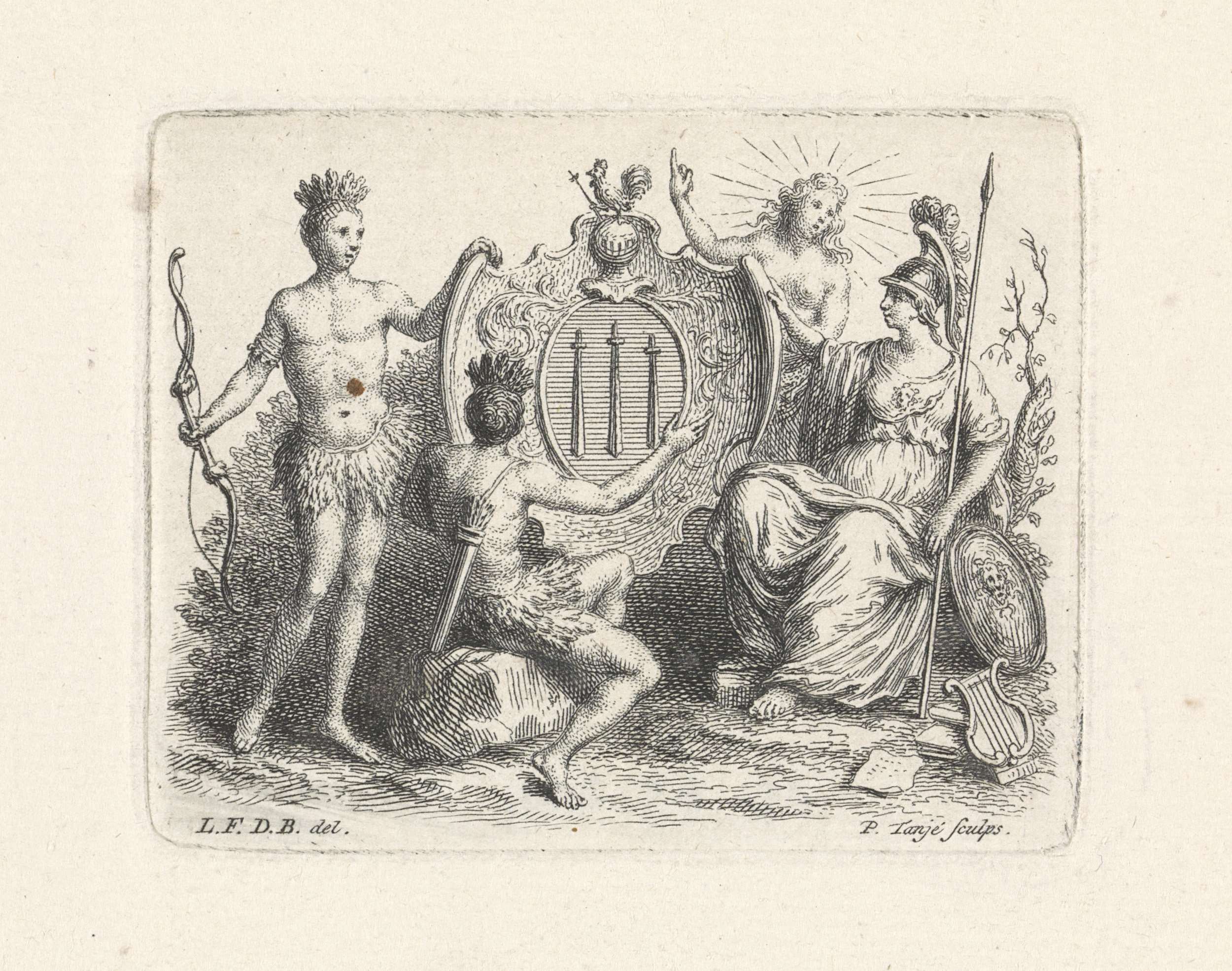 Bij een wapenschild, met daarop drie zwaarden en bovenop een haan, twee mannen gekleed in verenrok en met pijlen en boog. Rechts Waarheid, met stralenkrans, en Minerva, als godin van de kunst.
