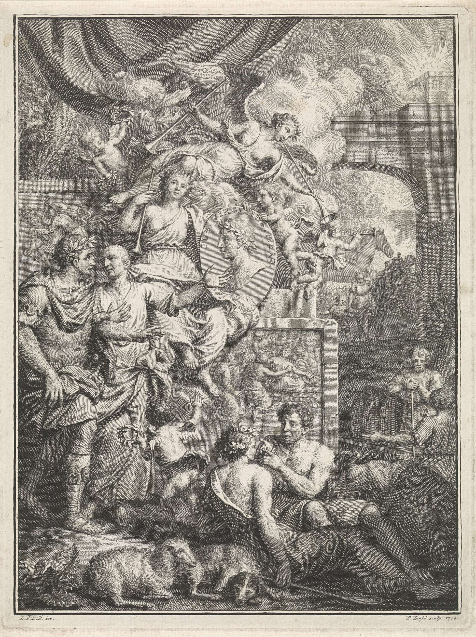 Faam toont een reliëf met het portret van de schrijver Publius Vergilius Maro. Victoria blaast de trompet. Rond het monument voor de schrijver zijn verschillende scènes uit zijn boek de Aeneis te zien. Op het monument een reliëf met de dood van Dido. Rechts op de achtergrond het brandende Troje met het Trojaanse paard en ...