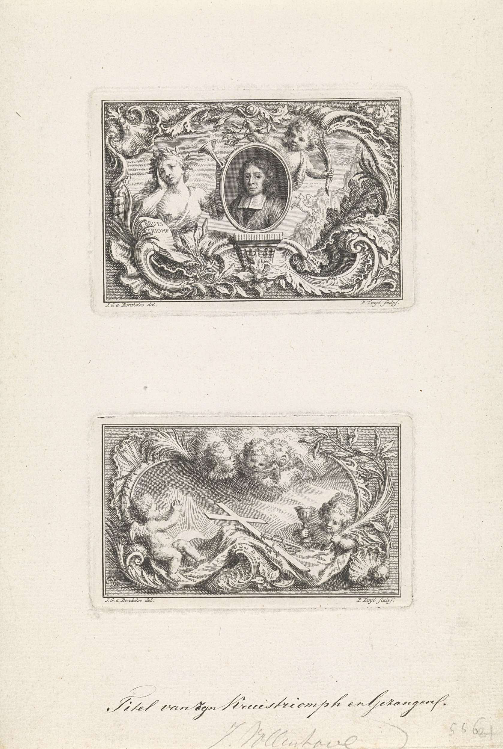 Twee voorstellingen op een blad. Boven: het portret van Joannes Vollenhove, predikant te Den Haag en schrijver van Kruistriomf en gezangen, wordt gekroond met een lauwerkrans door een putto. Op de achtergrond Pegasus bij de bron van poëtische inspiratie. Onder: een cartouche met twee putti bij het kruis van Christus. Een van hen houdt een ...