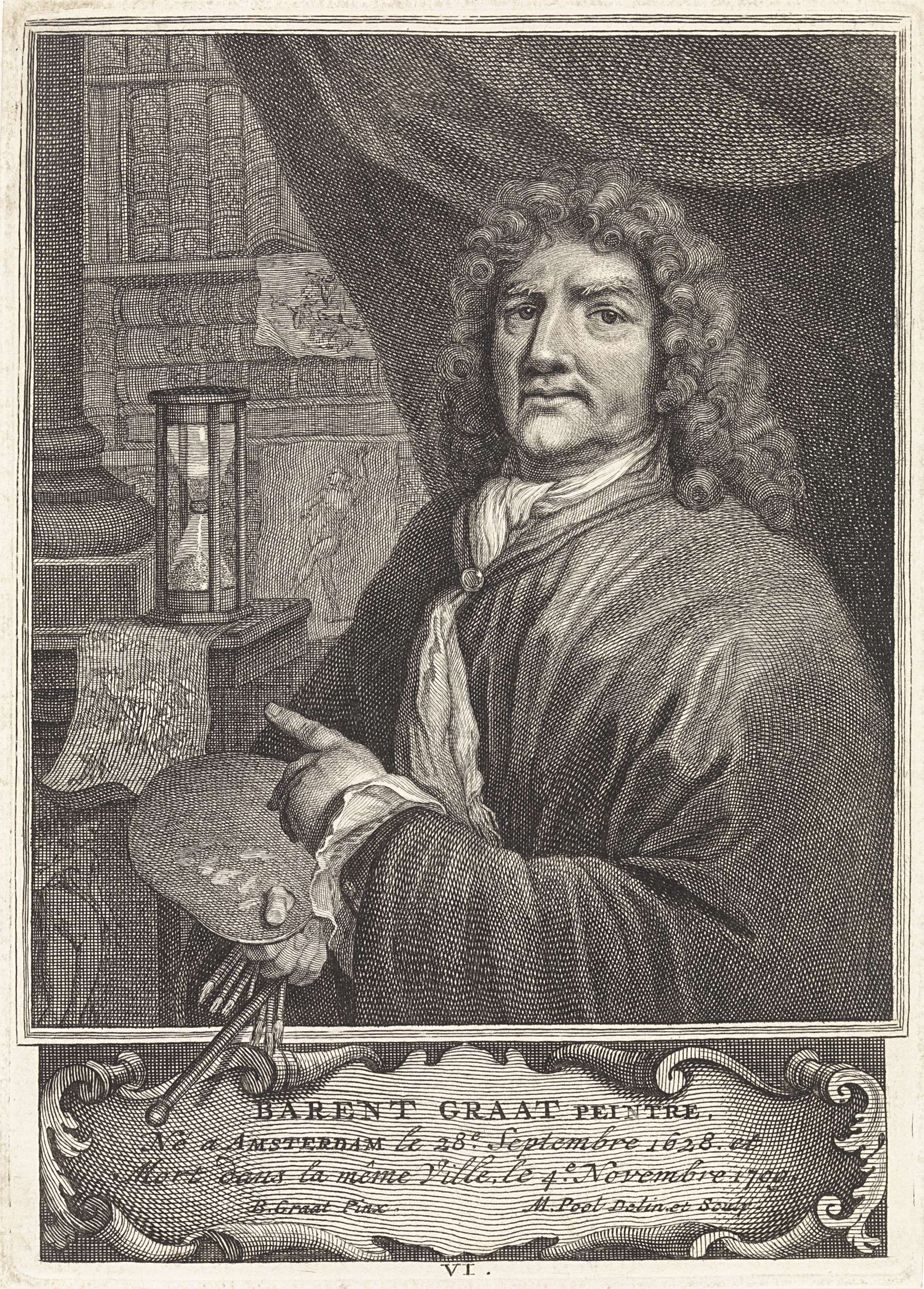 De kunstenaar Barend Graat staat in een studeervertrek. In zijn rechterhand houdt hij een schilderspalet en met zijn linkerhand wijst hij op een zandloper. In het vertrek hangen diverse tekeningen tussen boeken en planken. In de cartouche onder de voorstelling de naam van de kunstenaar en zijn biografische gegevens, in het Frans. Midden onder genummerd: ...