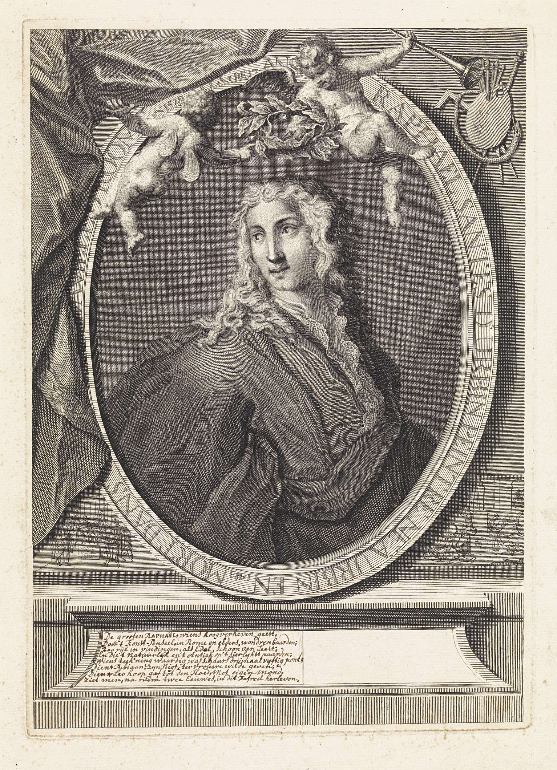 Allegorisch portret van de schilder Rafaël. Hij wordt gelauwerd door twee putti. Onder het portret vermoedelijk twee voorstellingen uit de klassieke geschiedenis. Op de piëdestal een handgeschreven lofdicht in het Nederlands.