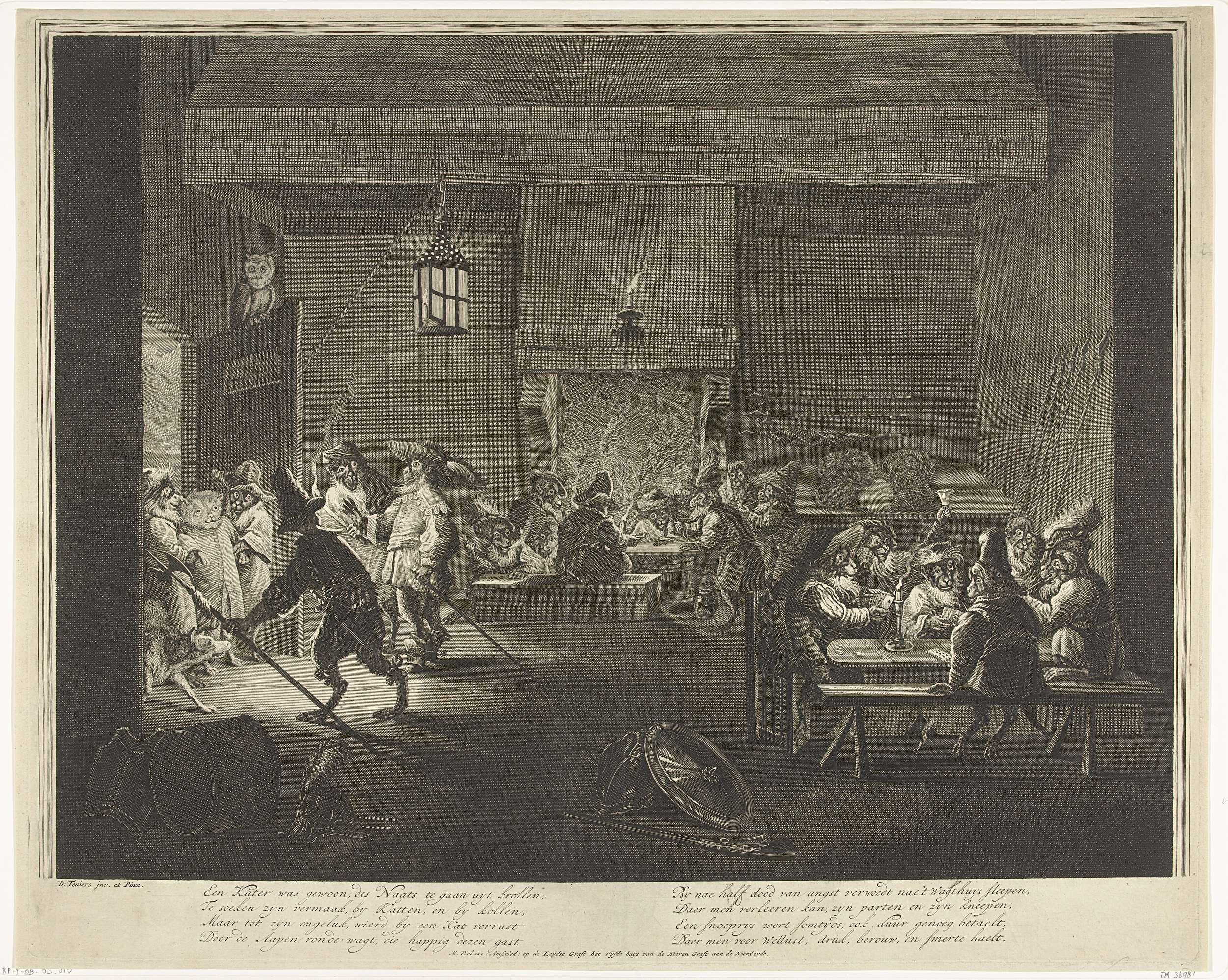Wachtlokaal of kortegaard waarin apen als soldaten kaarten en dobbelen, drinken en roken, Bij de deur wordt een kat door twee wachten binnengebracht. In het onderschrift twee vierregelige verzen.