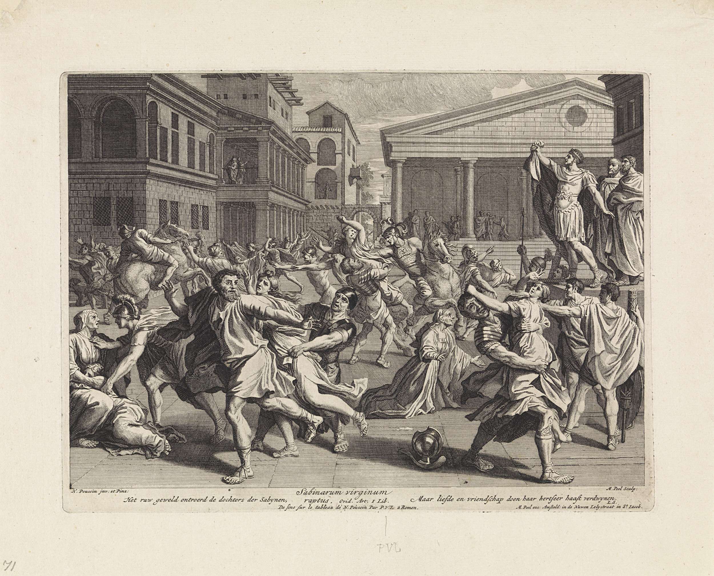 Romeinse soldaten grijpen de ongehuwde Sabijnse maagden vast en trachten hen mee te nemen naar Rome. Rechts staat Romulus, die zijn soldaten het teken geeft om de maagden weg te voeren. In de marge een onderschrift in het Nederlands.