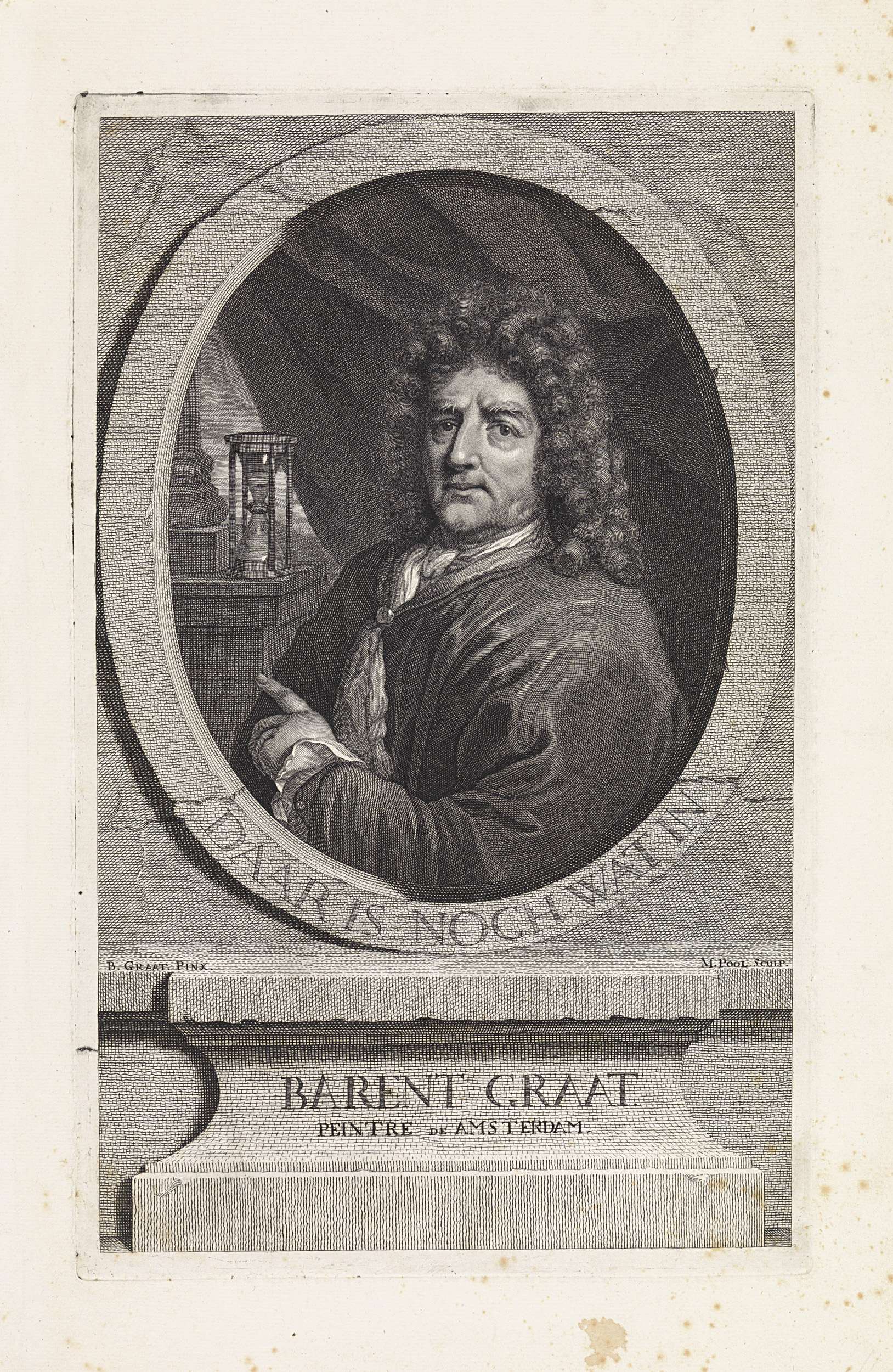 Portret van de schilder Barend Graat. Met zijn linkerhand wijst hij op een zandloper.