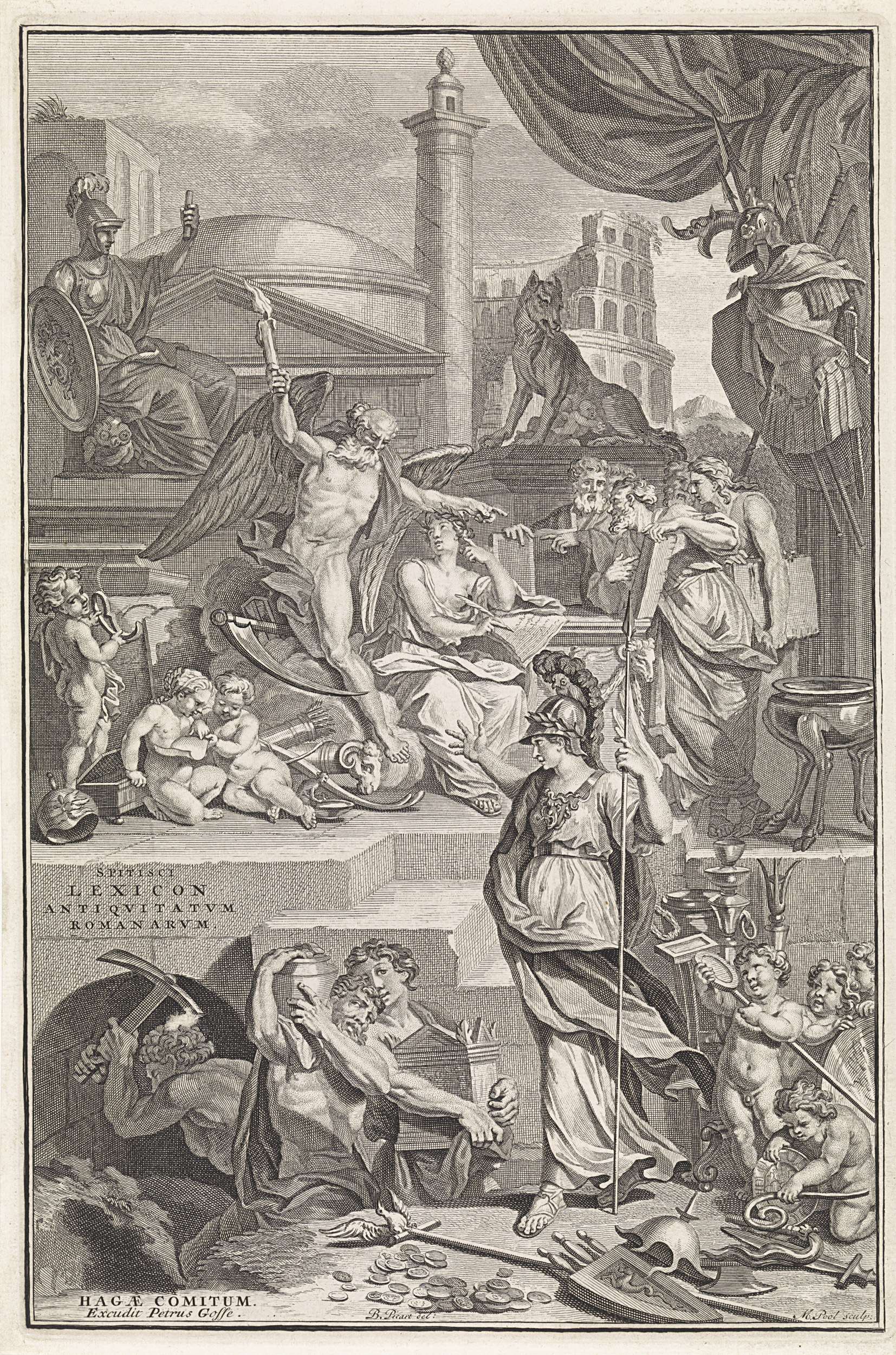 Geschiedenis schrijft de geschiedenis van Rome. Ze kijkt op naar Vader Tijd die een brandende fakkel in de hand houdt en haar wijst op een groep filosofen. Op de voorgrond Minerva die mannen opdraagt om munten op te graven. Op de achtergrond diverse monumenten uit Rome.