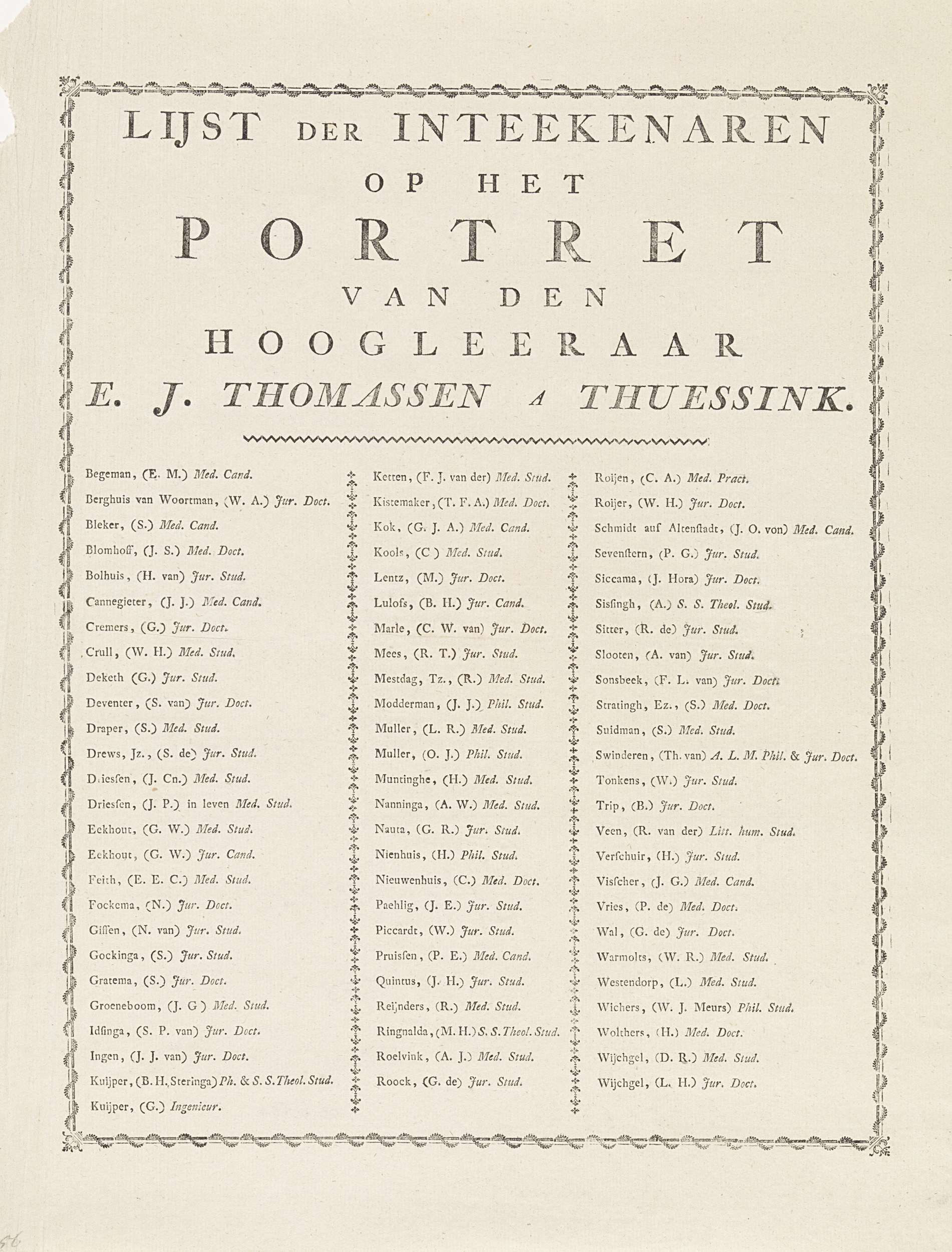 Alfabetisch geordende intekenlijst met namen van personen, in drie kolommen, die hebben ingetekend op de prent met het portret van Evert Jan Thomassen a Thuessink. De lijst is gevat in een ornamentele omlijsting.