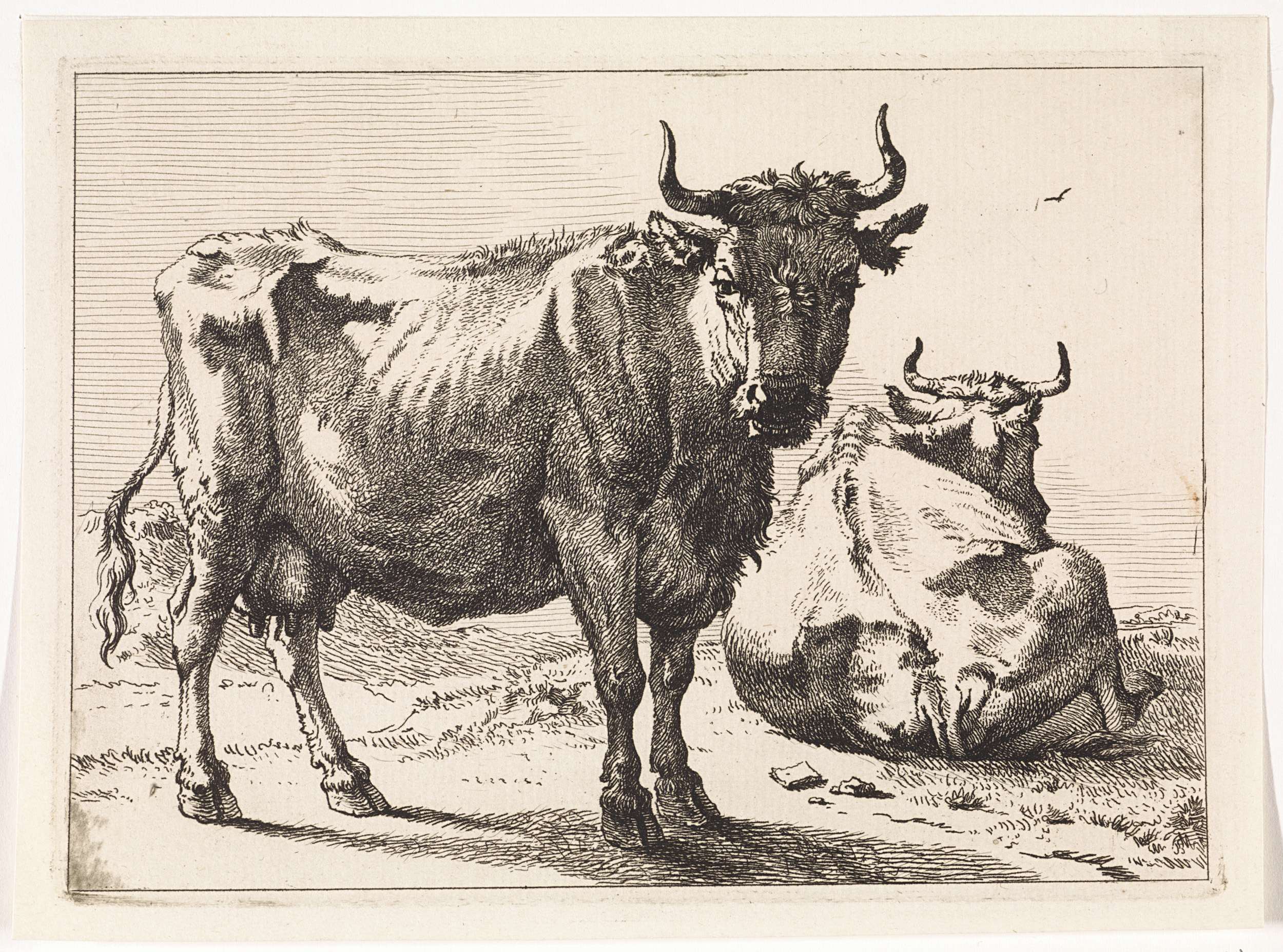 Een staande koe, van de zijkant gezien, en een liggende koe, van achteren gezien.