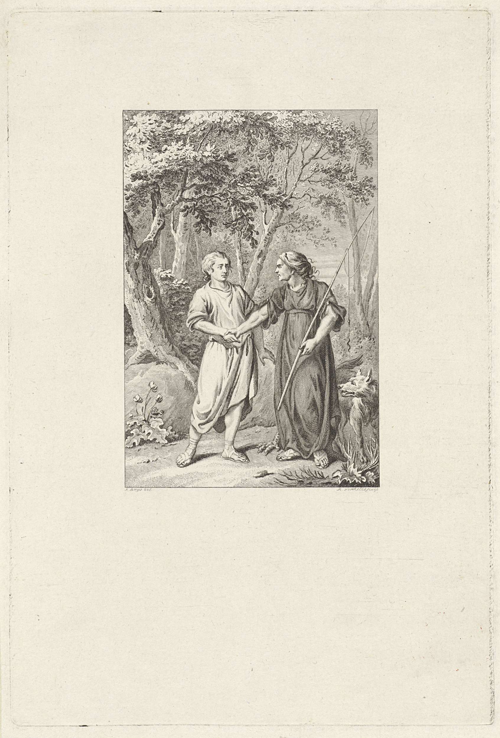 Bosgezicht met een vrouw met hengel die een man bij de hand pakt
