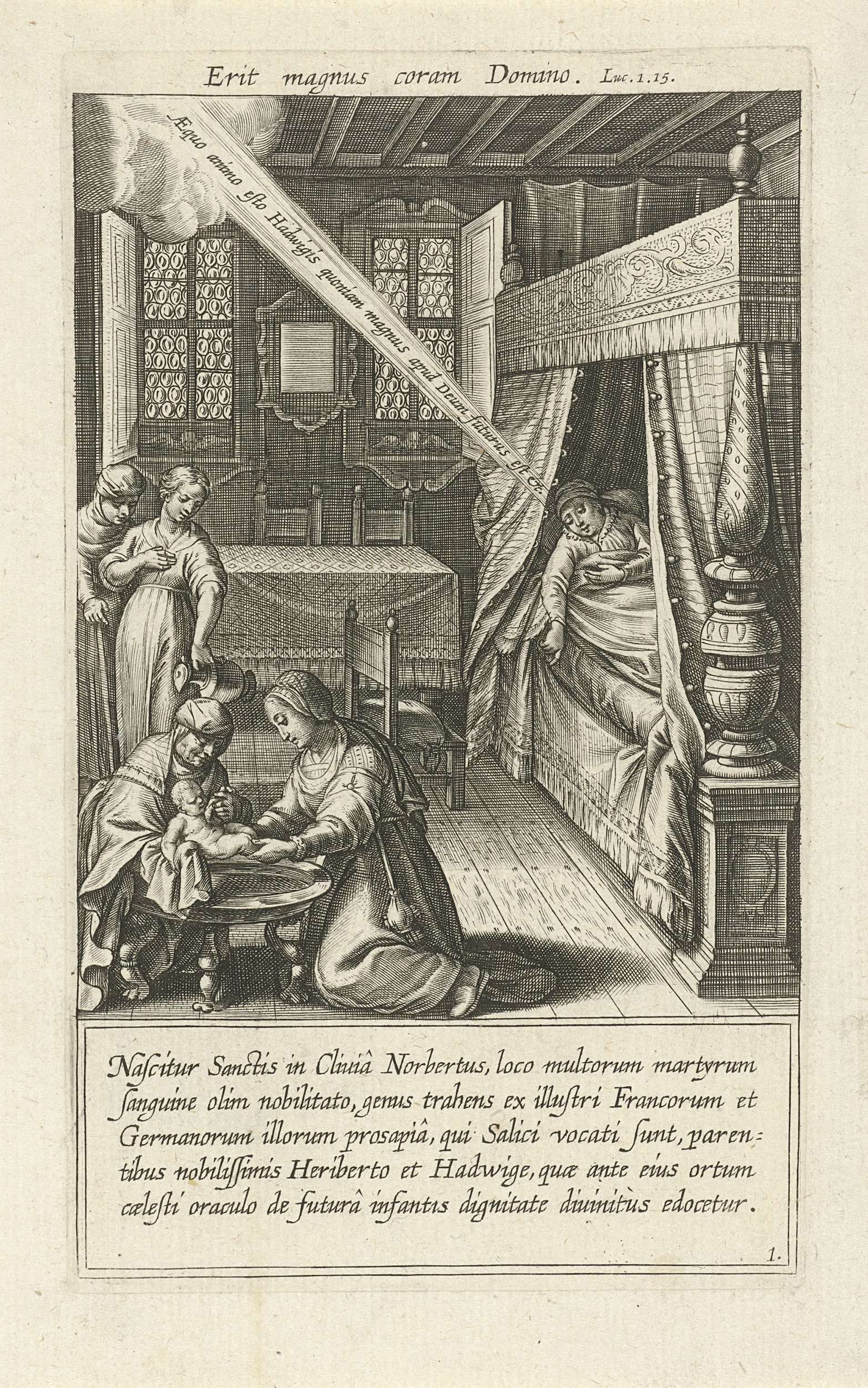 Na de geboorte van de heilige Norbertus wordt het kind gewassen door vroedvrouwen. In het kraambed hoort Hedwig, de moeder van Norbertus, de stem van God die haar verkondigt dat Norbertus een grote toekomst zal hebben. De prent heeft twee Latijnse opschriften: een boven en een onder de voorstelling.