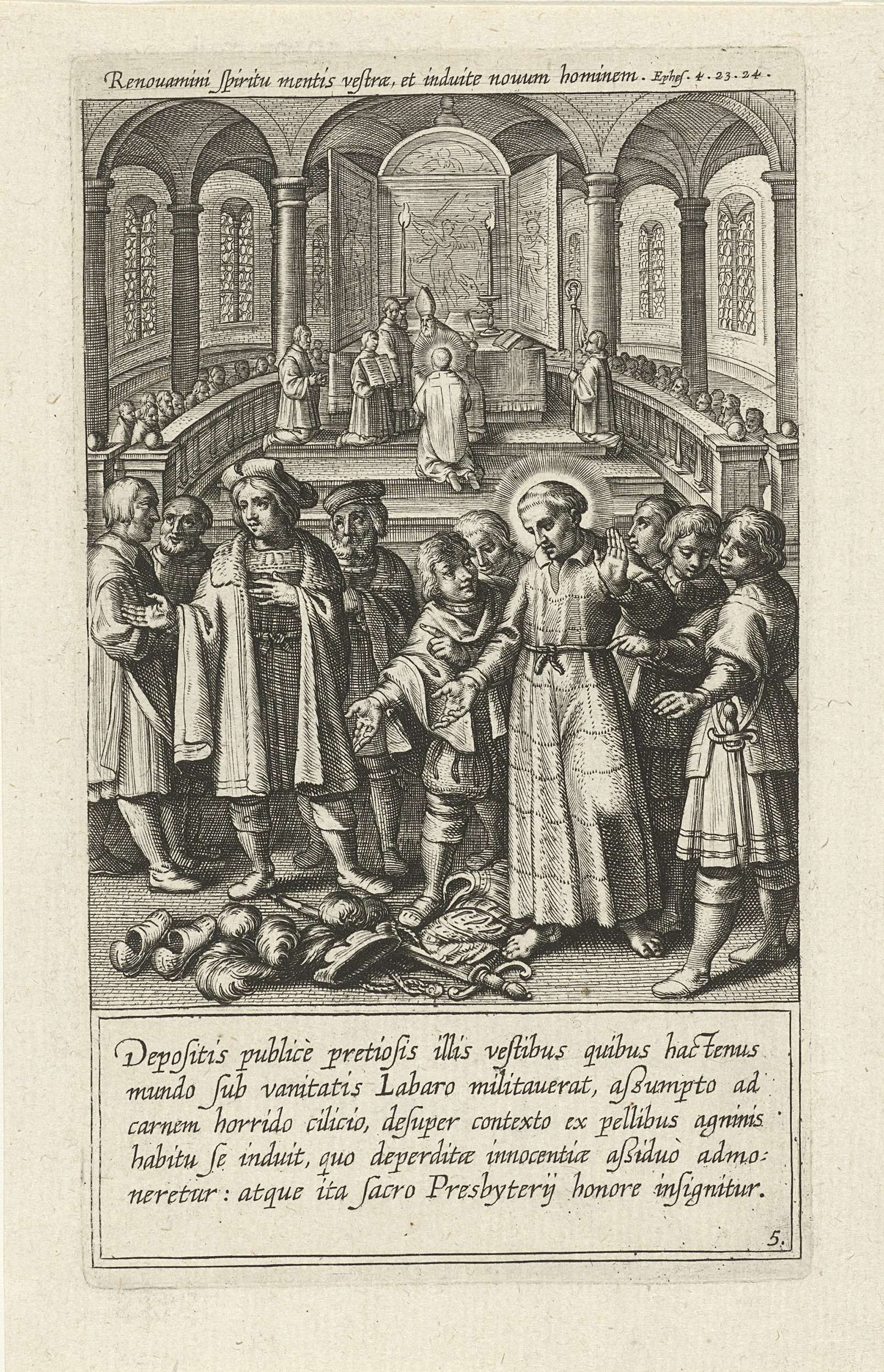 De heilige Norbertus legt de gelofte van armoede af en verwijdert al zijn waardevolle bezittingen. In de achtergrond wordt hij tot priester gewijd door de aartsbisschop van Keulen. De prent heeft twee Latijnse opschriften: een boven en een onder de voorstelling.