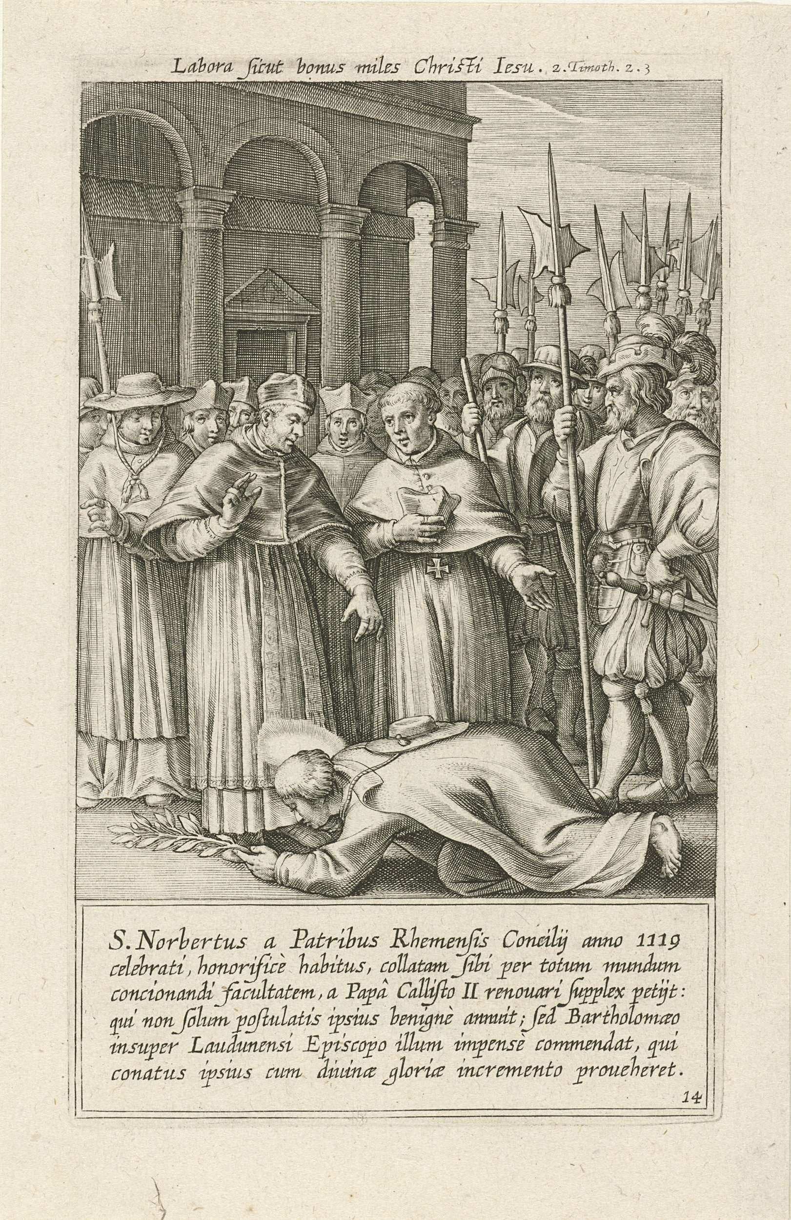 De heilige Norbertus knielt voor paus Calixtus II en kust zijn voeten. De prent heeft twee Latijnse opschriften: een boven en een onder de voorstelling.