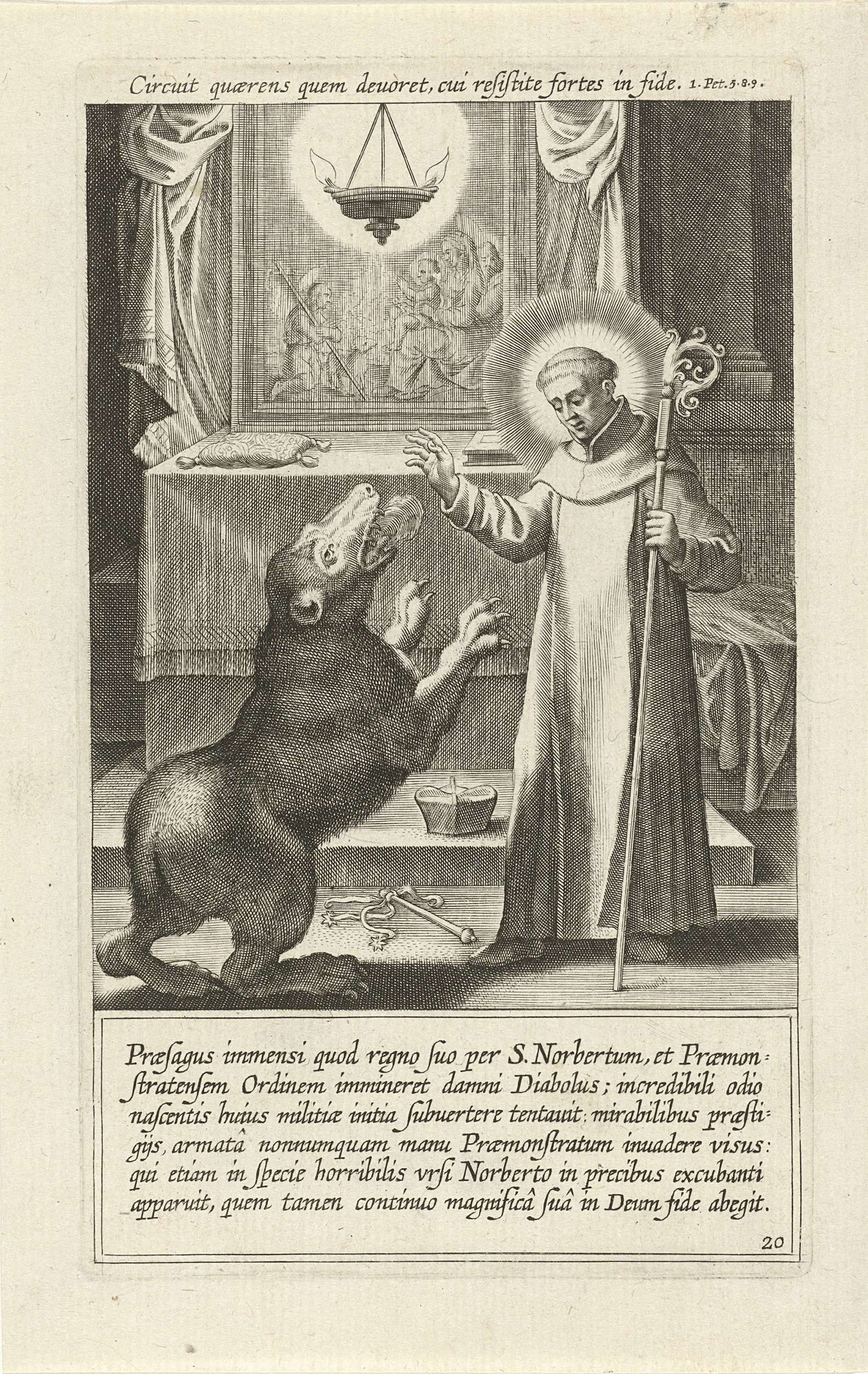De heilige Norbertus bidt alleen in een kerk als de duivel verschijnt in de gedaante van een woeste beer. De heilige Norbertus jaagt het beest weg. De prent heeft twee Latijnse opschriften: een boven en een onder de voorstelling.