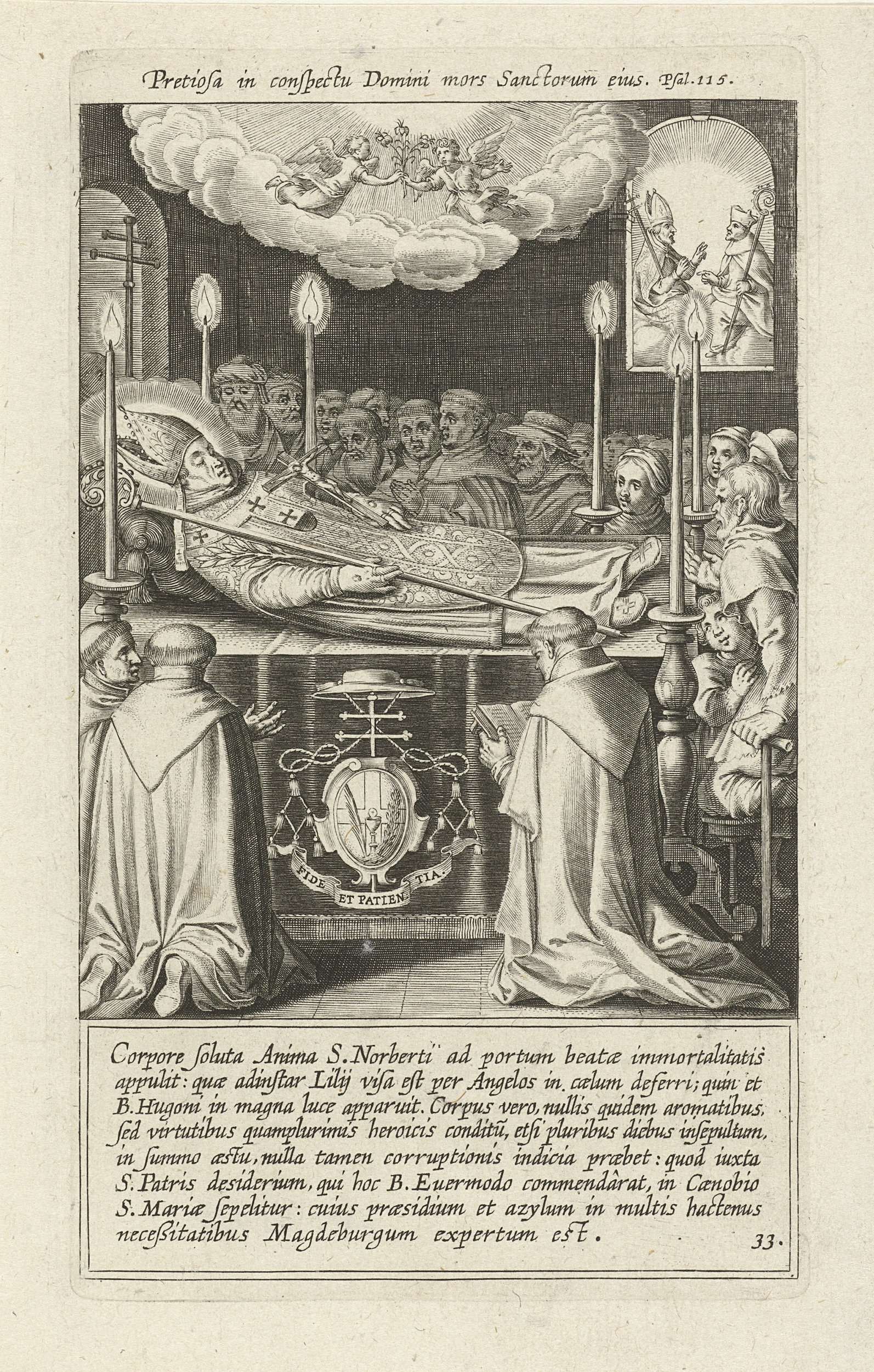 De heilige Norbertus ligt in zijn ambtsgewaad van aartsbisschop opgebaard in Maagdenburg. Rondom hem biddende monniken. Boven in de lucht vliegen twee engelen. De prent heeft twee Latijnse opschriften: een boven en een onder de voorstelling.