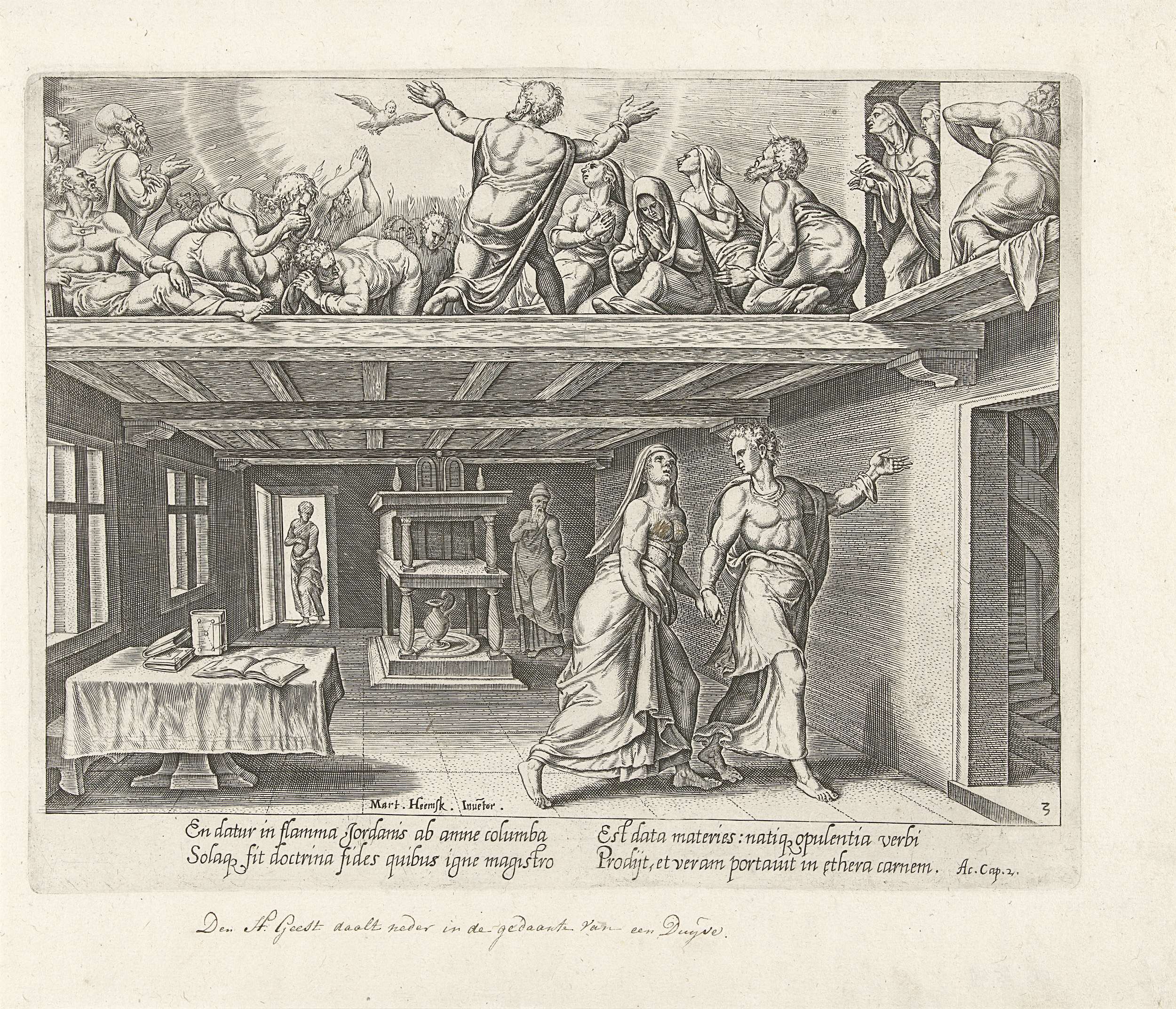 Op de bovenste verdieping de leerlingen van Christus. Boven hen zweeft de duif van de Heilige Geest. De prent heeft een Latijns onderschrift en maakt deel uit van een 34-delige serie met als onderwerp de Handelingen van de apostelen.