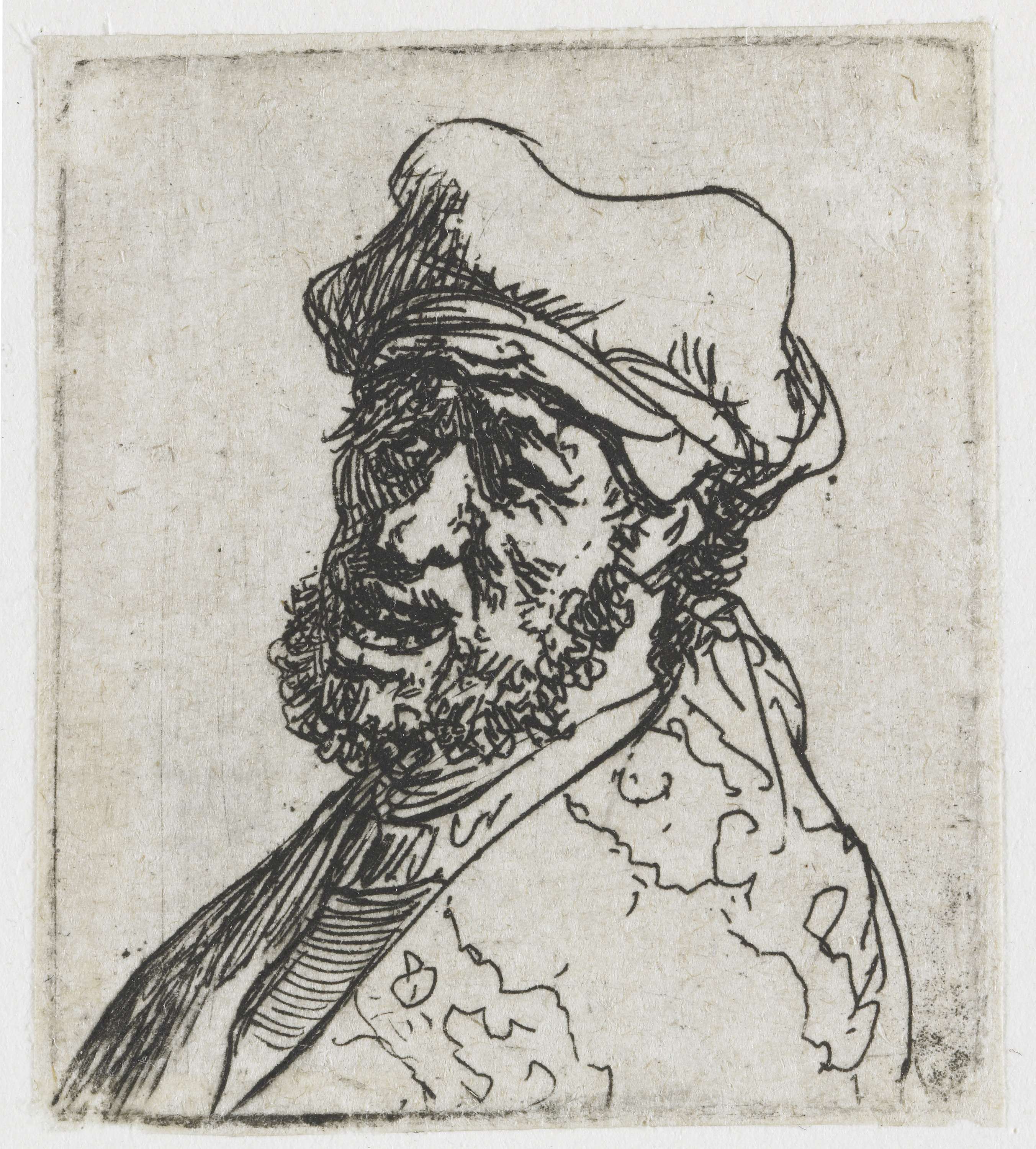 Opnieuw vijf kleine manskopjes, maar nu is zeker dat ze niet als losse prentjes zijn ontstaan. Oorspronkelijk stonden ze allemaal op een en dezelfde koperplaat. Nadat Rembrandt die plaat had verknipt, voltooide hij de etsjes afzonderlijk. Deze werkwijze was ongewoon en ook dat karakteriseert Rembrandt, die als kunstenaar wel vaker de ongebaande paden koos.