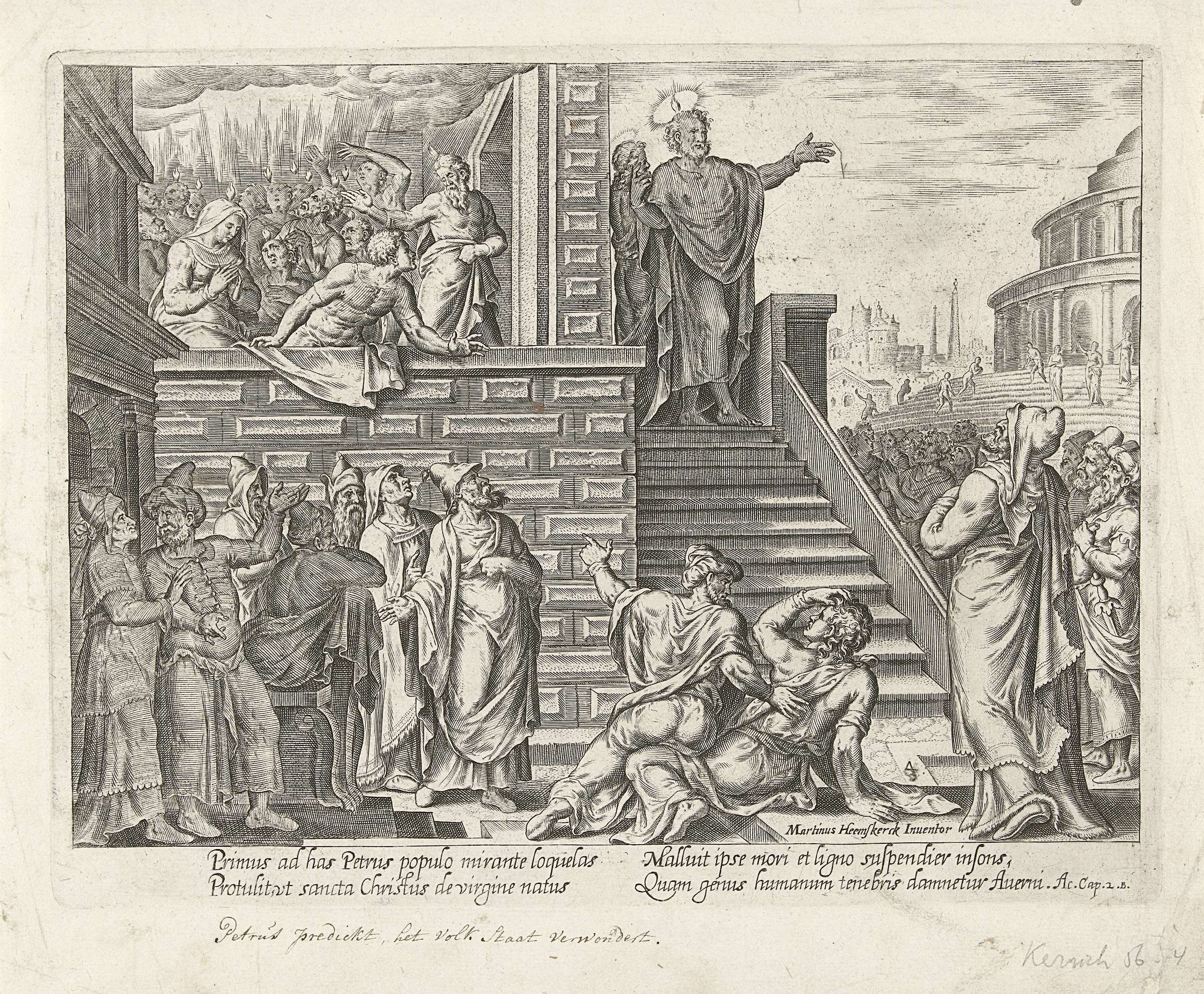 In de achtergrond worden de leerlingen van Christus binnenkamers bezocht door de Heilige Geest, in de vorm van een vlam boven hun hoofden. De apostel Petrus staat buiten het huis en verkondigt de boodschap van Christus. De prent heeft een Latijns onderschrift en maakt deel uit van een 35-delige serie met als onderwerp de Handelingen ...