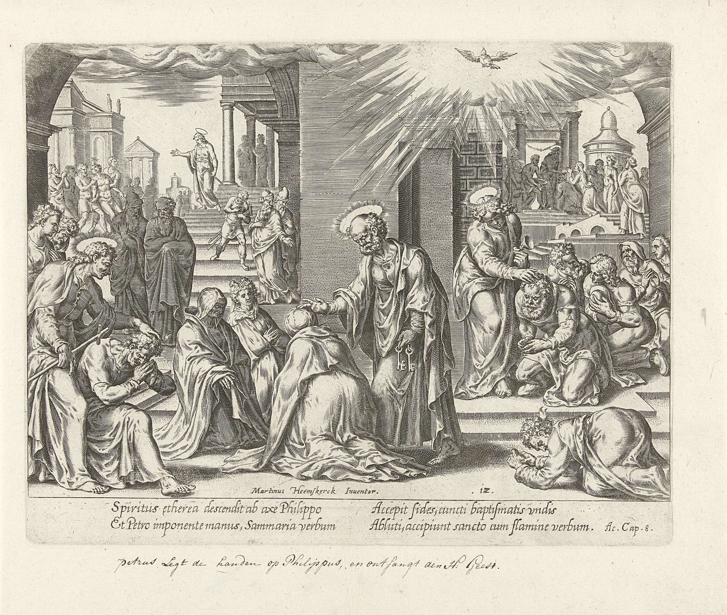 De apostelen Petrus, Johannes en Filippus trekken naar Samaria en genezen daar zieken en bezetenen. In de voorgrond leggen de drie hun handen op gelovigen. Door de handoplegging van de apostelen raken zij vervuld van de Heilige Geest. De prent heeft een Latijns onderschrift en maakt deel uit van een 34-delige serie met als onderwerp ...