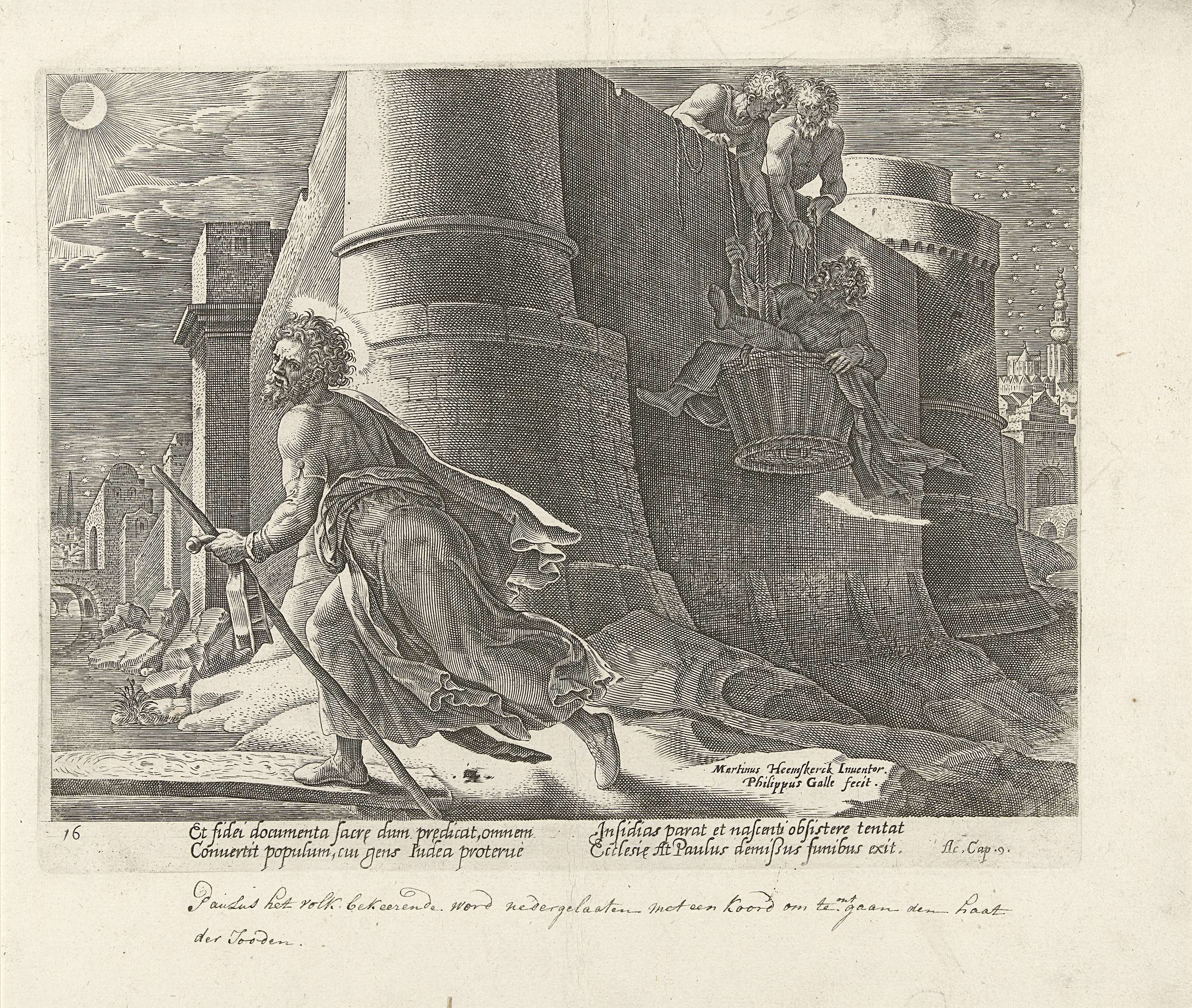 Paulus ontvlucht de stad Damascus in de nacht. Hij wordt van de stadsmuur neergelaten met een mand en trekt dan te voet weg. De prent heeft een Latijns onderschrift en maakt deel uit van een 34-delige serie met als onderwerp de Handelingen van de apostelen.