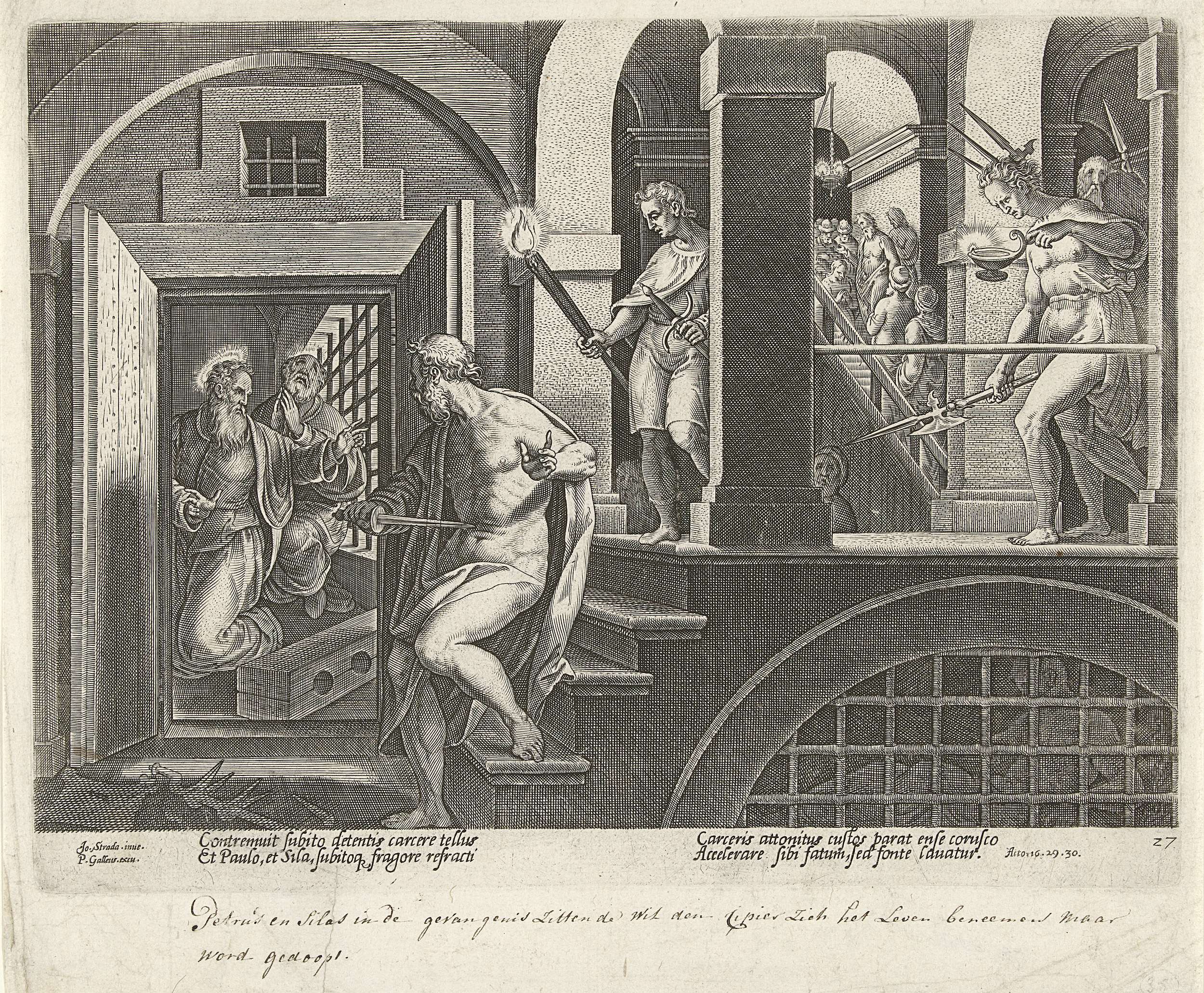 De gevangenenbewaarder van Filippi poogt zelfmoord te plegen wanneer hij merkt dat de gevangenisdeuren open zijn. Hij vreest dat de gevangen zullen zijn ontsnapt. De apostel Paulus en zijn gezel Silas zijn echter in de cel blijven zitten. Paulus bekeert de gevangenenbewaarder vervolgens. De prent heeft een Latijns onderschrift en maakt deel uit van een ...