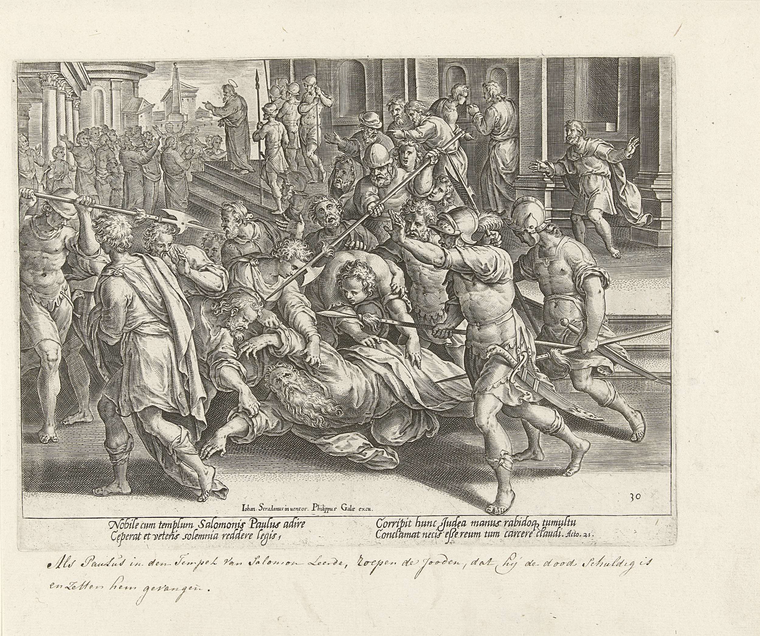 Wanneer de apostel Paulus in Jeruzalem de tempel wil betreden, wordt hij door de Joden tegen de grond gesleurd en geslagen. Romeinse soldaten verwijderen de oproerkraaiers en arresteren Paulus. Op de achtergrond spreekt Paulus de Joodse menigte toe, vlak na zijn arrestatie. De prent heeft een Latijns onderschrift en maakt deel uit van een 34-delige ...
