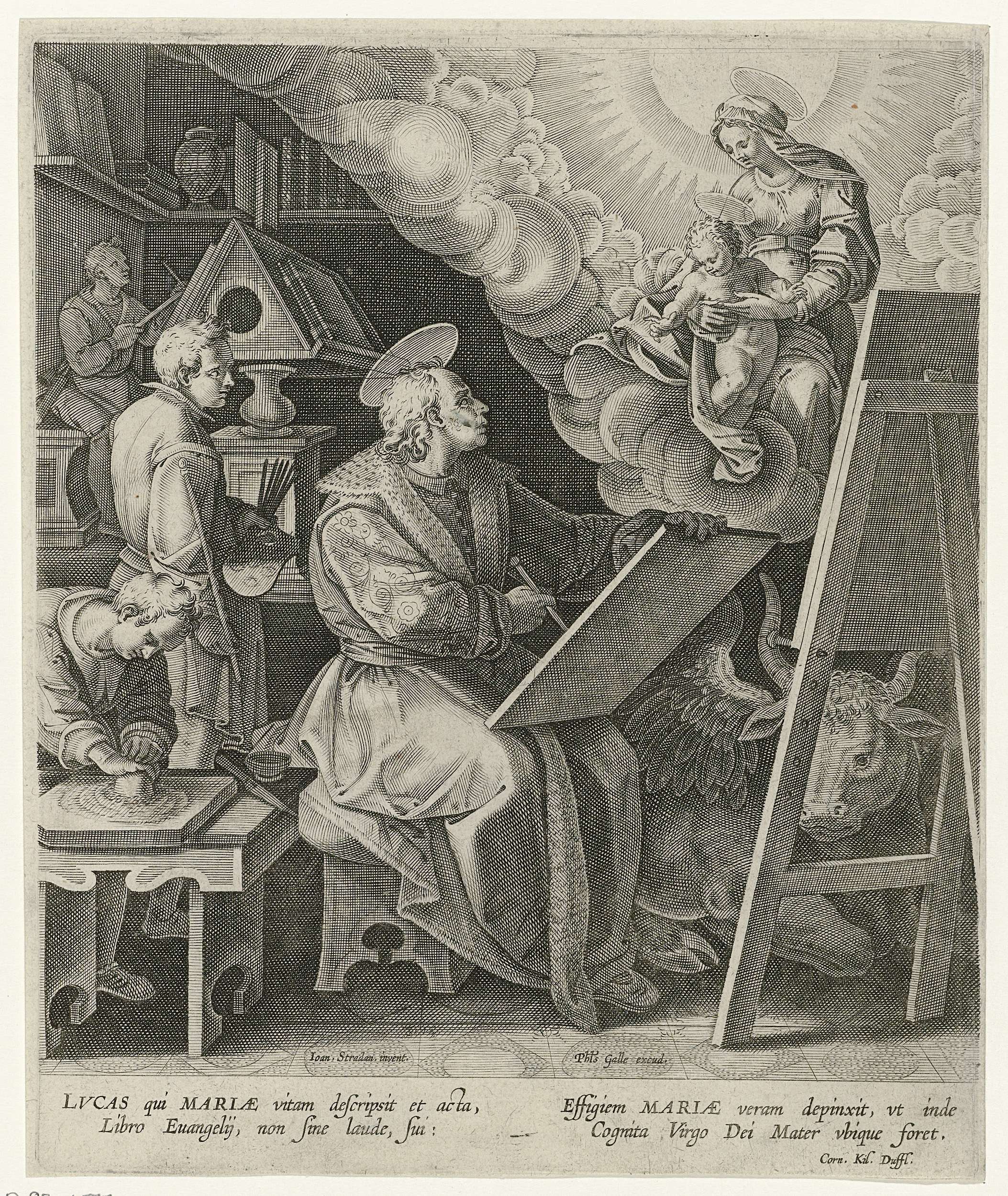 De evangelist Lucas in zijn atelier, samen met werkjongens die allerlei schildersactiviteiten uitvoeren. De heilige Lucas zit achter een schildersezel en kijkt naar de verschijning van Maria en kind. Naast hem op de grond de os als zijn attribuut. De prent heeft een Latijns attribuut.