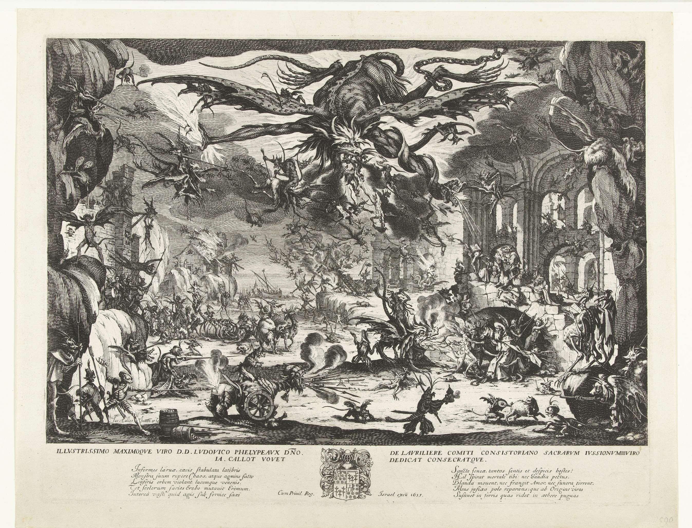 In een rotsachtig landschap met enkele ruïneuze gebouwen zijn vele duivelse wezens bezig met brandstichting, vechten en martelen. Middenboven een opvallend groot, rookbrakend monster. Rechts op het middenplan de Heilige Antonius bij een kerker, lastig gevallen door demonen. Onder de voorstelling een Latijns onderschrift en een wapenschild.