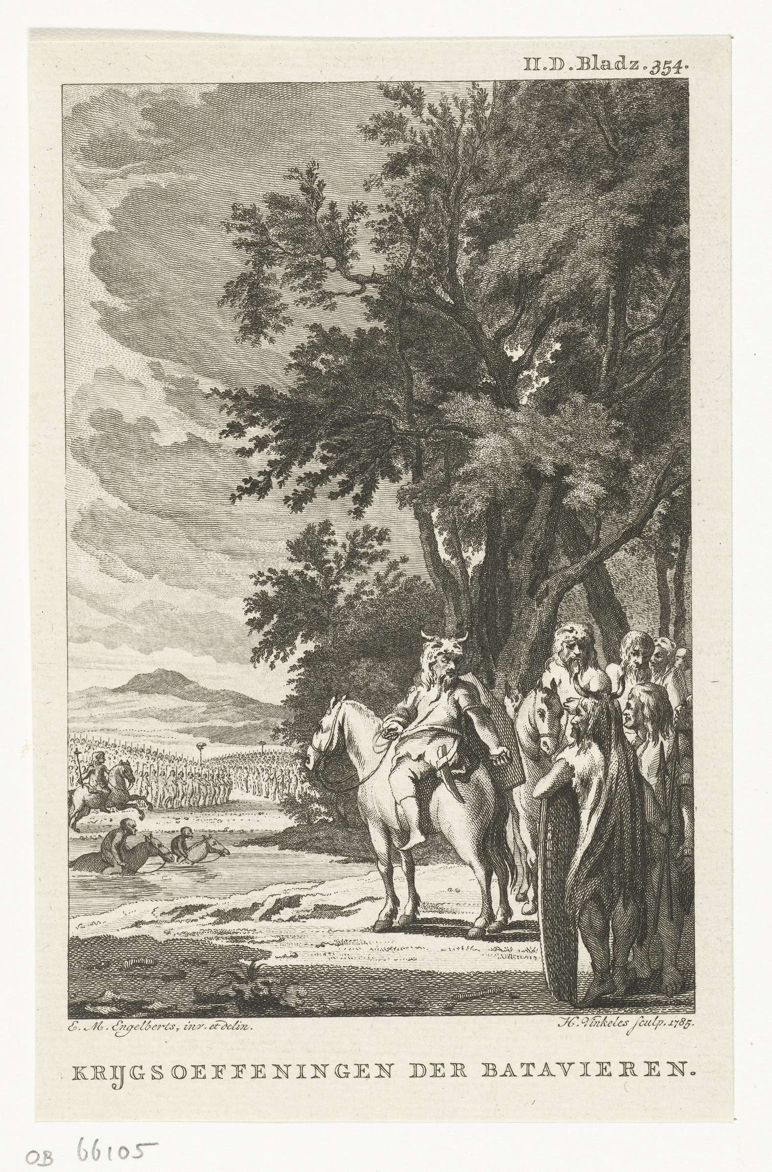 Krijgsoefeningen bij de Bataven. Rechtsboven: II.D. Bladz. 354.