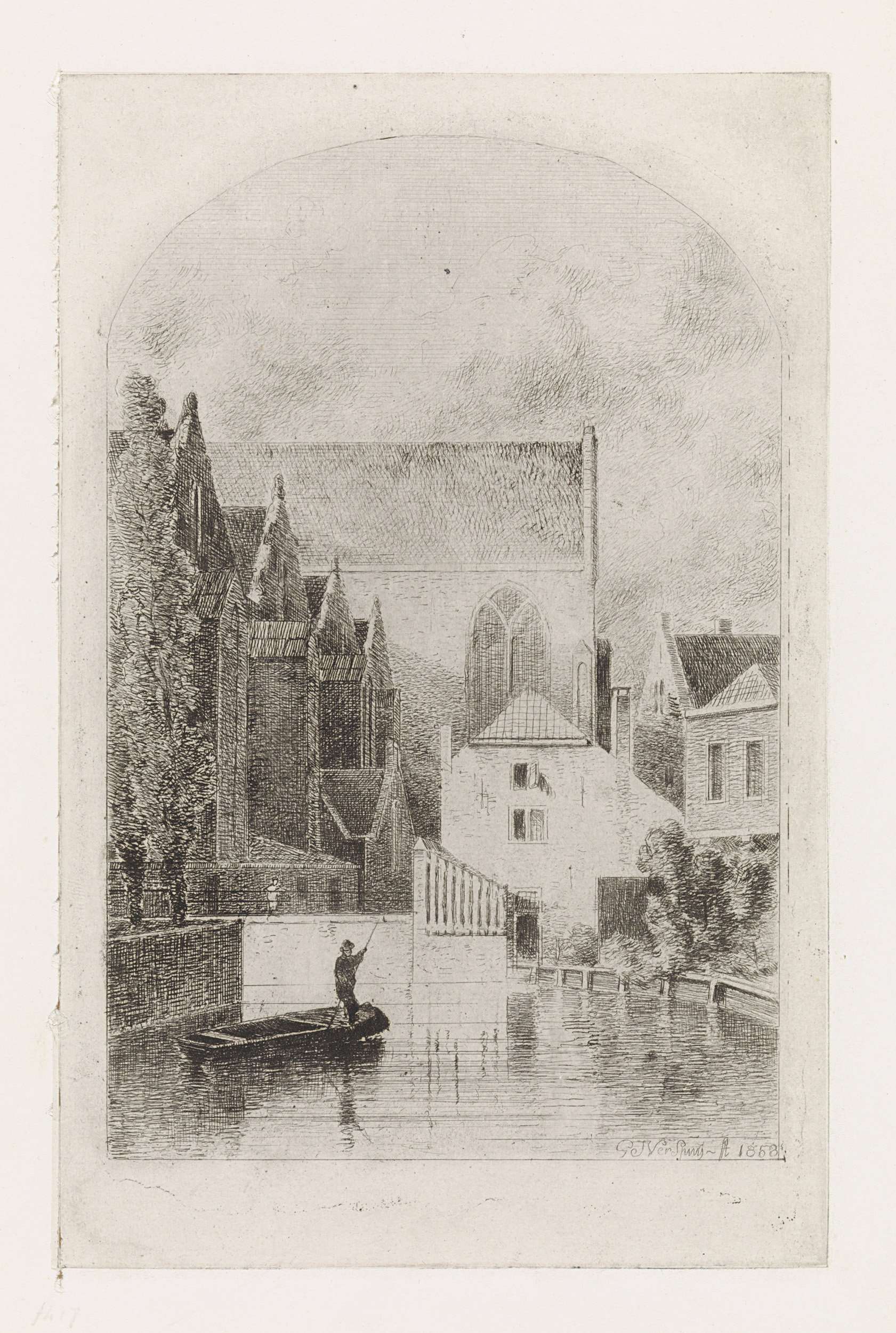 Een man boomt met een vaarboom een schuit voort in een gracht tussen huizen. In het midden een kerkgebouw.