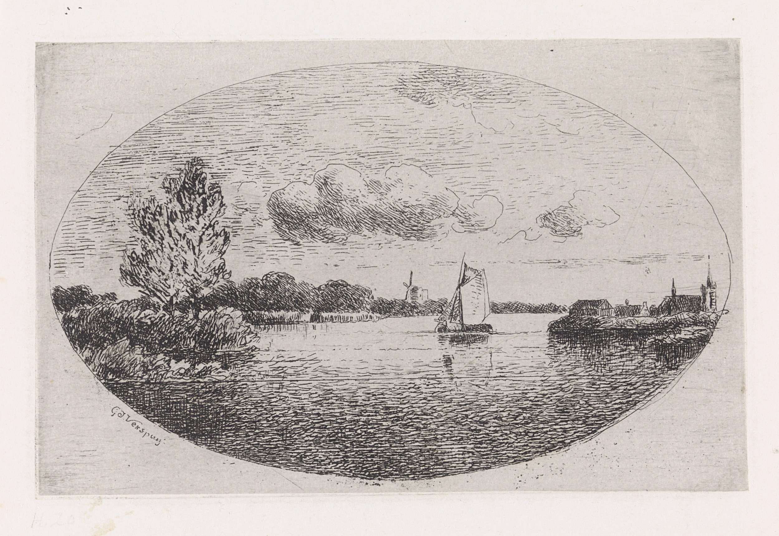 Een zeilschip op een rivier met op de rechteroever een dorp. In de verte een molen.
