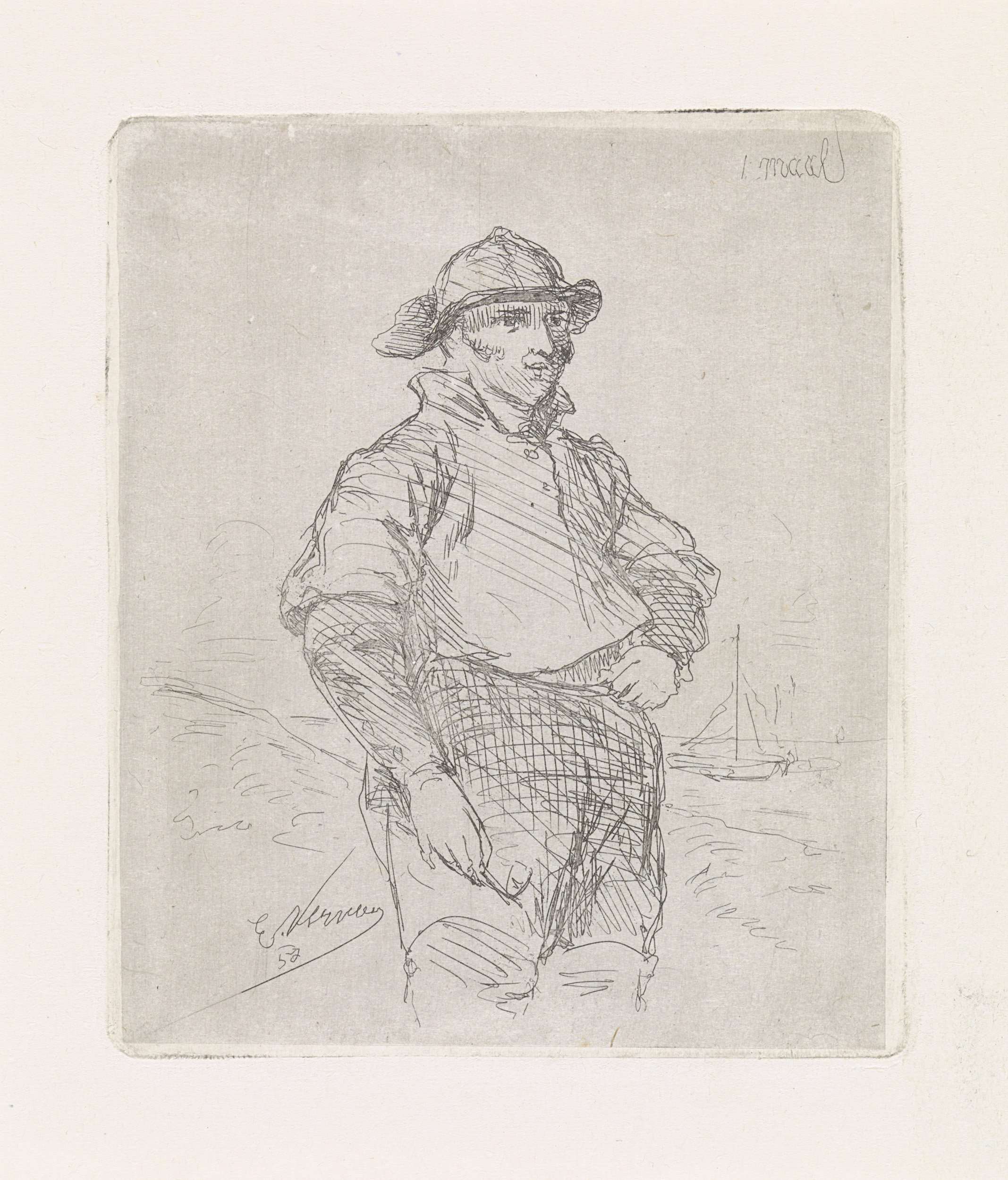Een staande Scheveningse visser met een pijp in zijn ene hand en zijn andere hand in zijn zij.