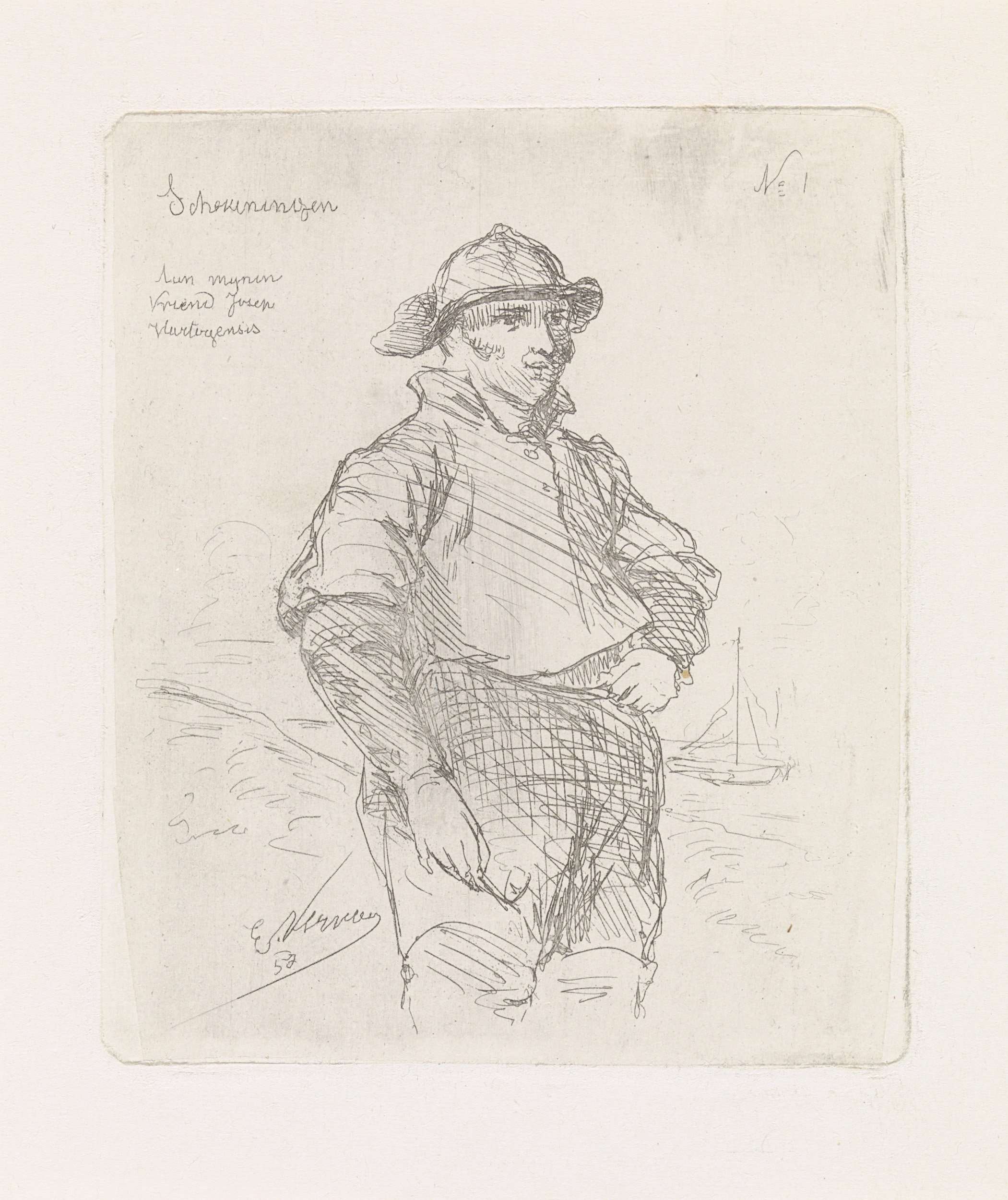 Een staande Scheveningse visser met een pijp in zijn ene hand en zijn andere hand in zijn zij.