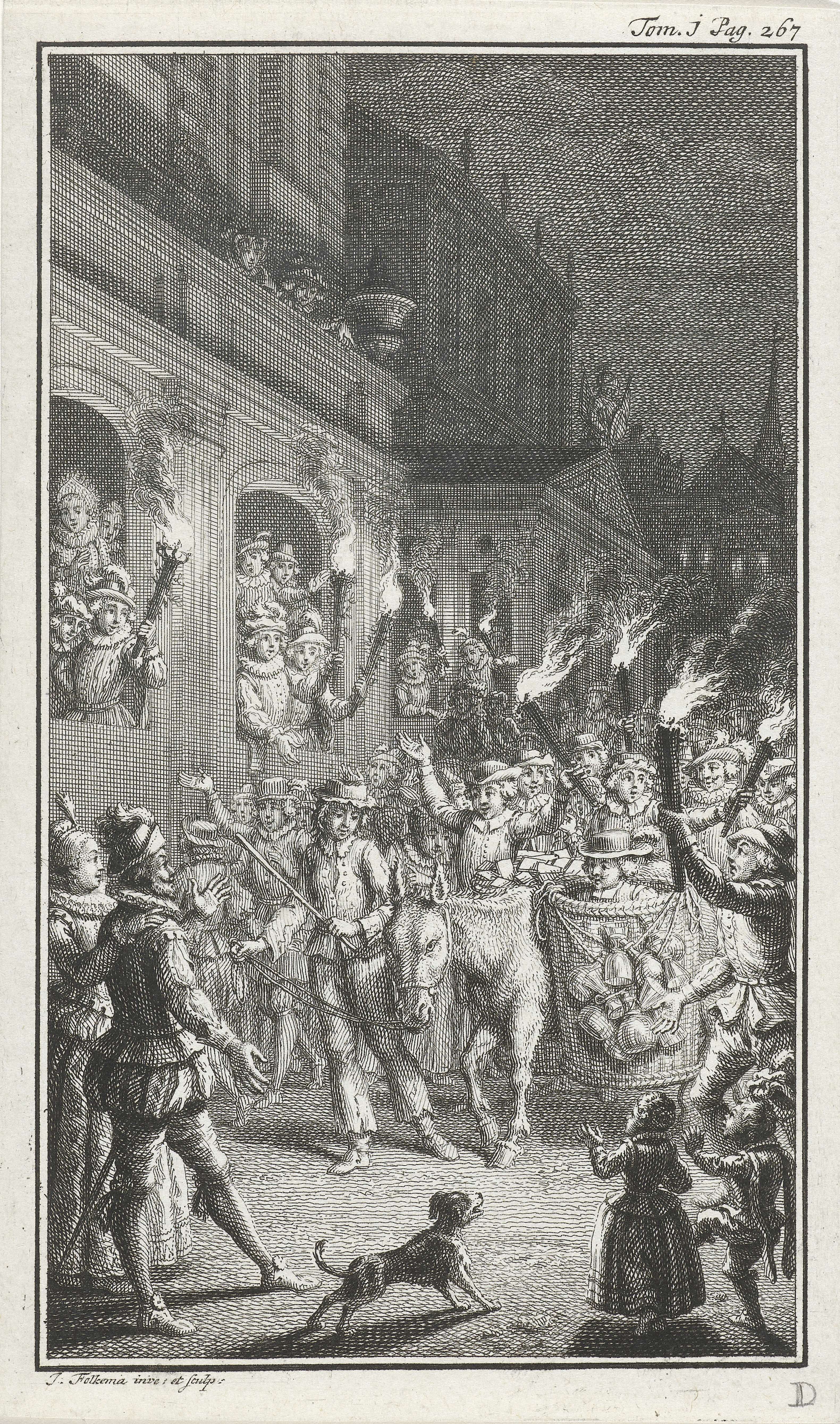 Een menigte mensen loopt met een fakkel mee met een optocht waarin rechts een man in een mand wordt meegevoerd. Vanuit hun huizen bekijken toeschouwers de optocht. Prent rechtsboven gemerkt: Tom. i. pag. 267.