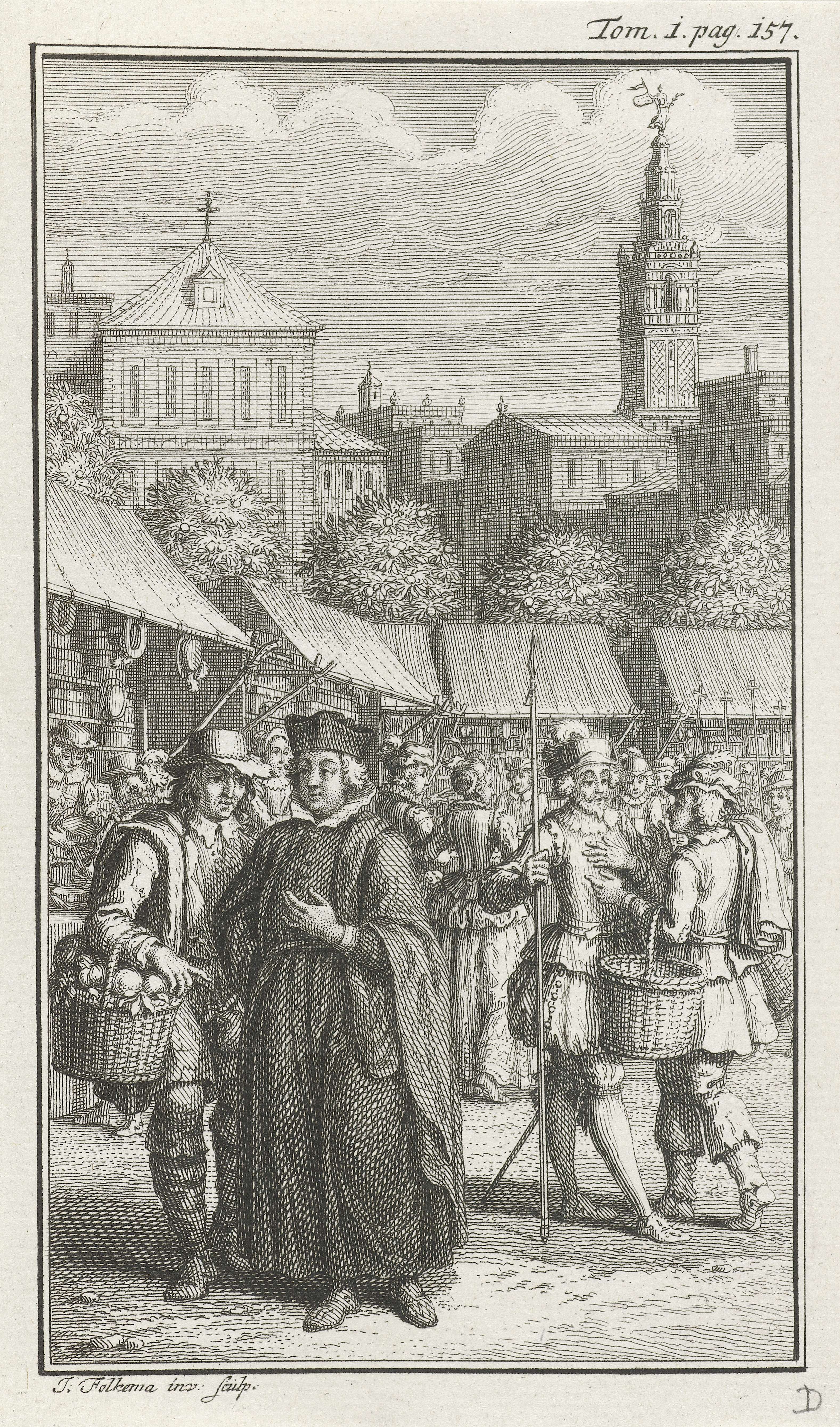 Op de markt besteelt een dief een geestelijke, even verderop houdt zijn handlanger een soldaat bezig. Prent rechtsboven gemerkt: Tom. i. pag. 157.